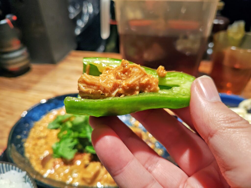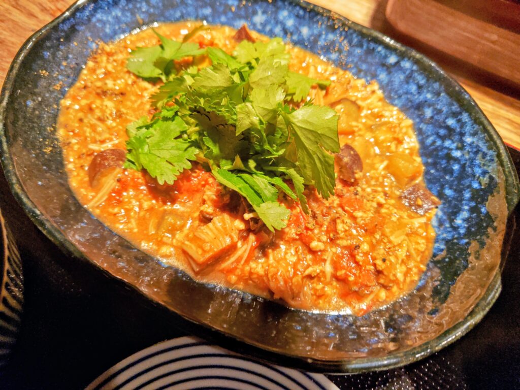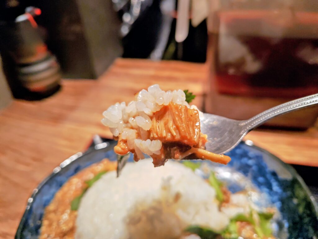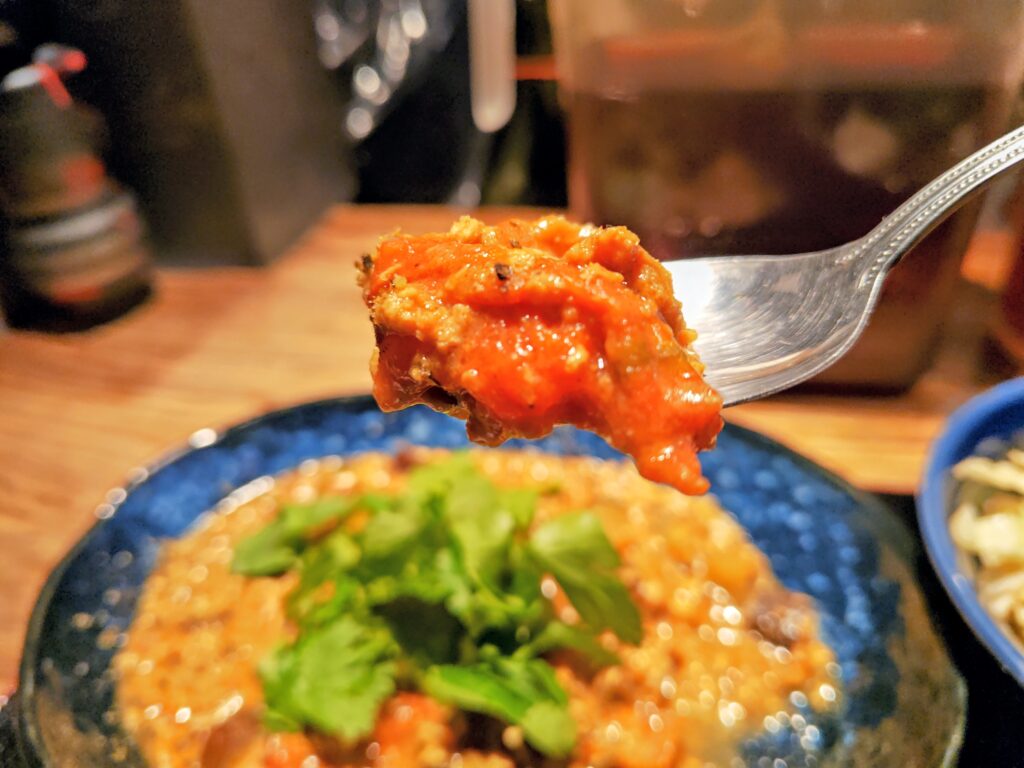 鶏ミンチ、トマト、ナス、エノキの組合せにスパイスがのり、かなりヘルシーに仕上がっています。