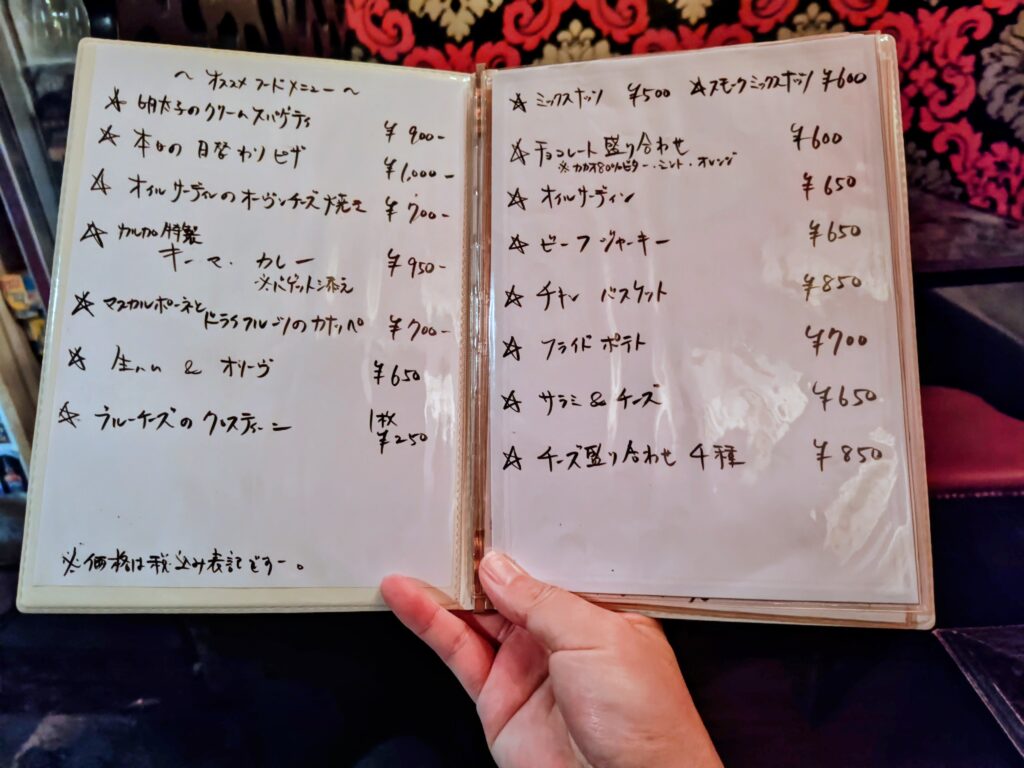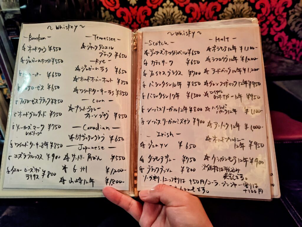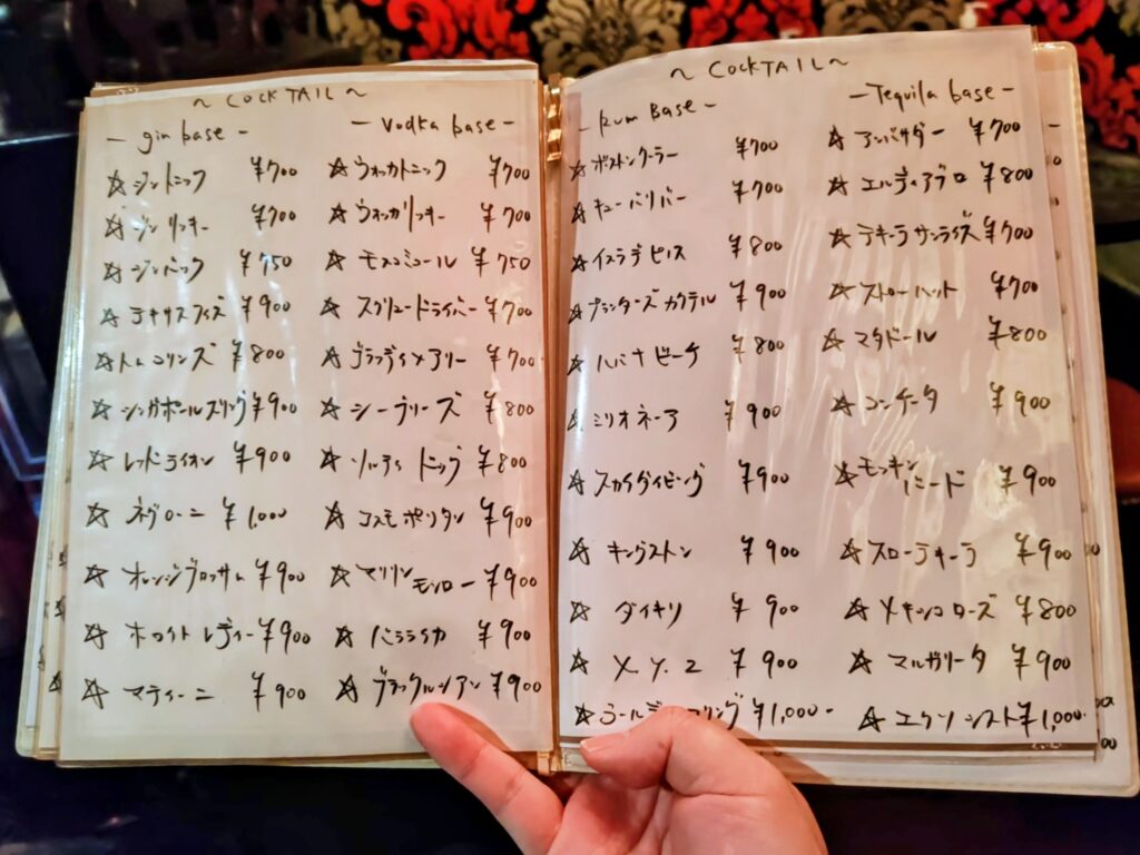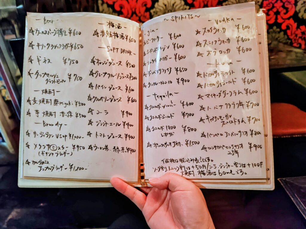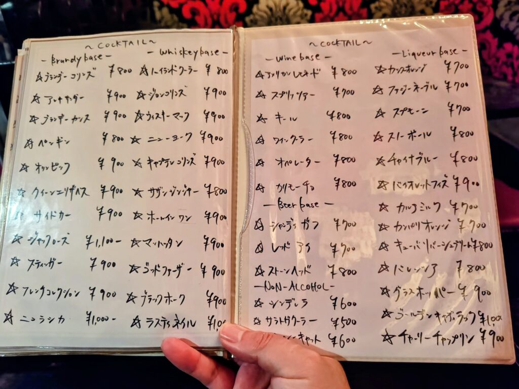 手書きのドリンクメニューはビール、焼酎、ブランデー、梅酒、ソフトドリンク、スピリッツ、カクテル、ウィスキーと多種多様!!!