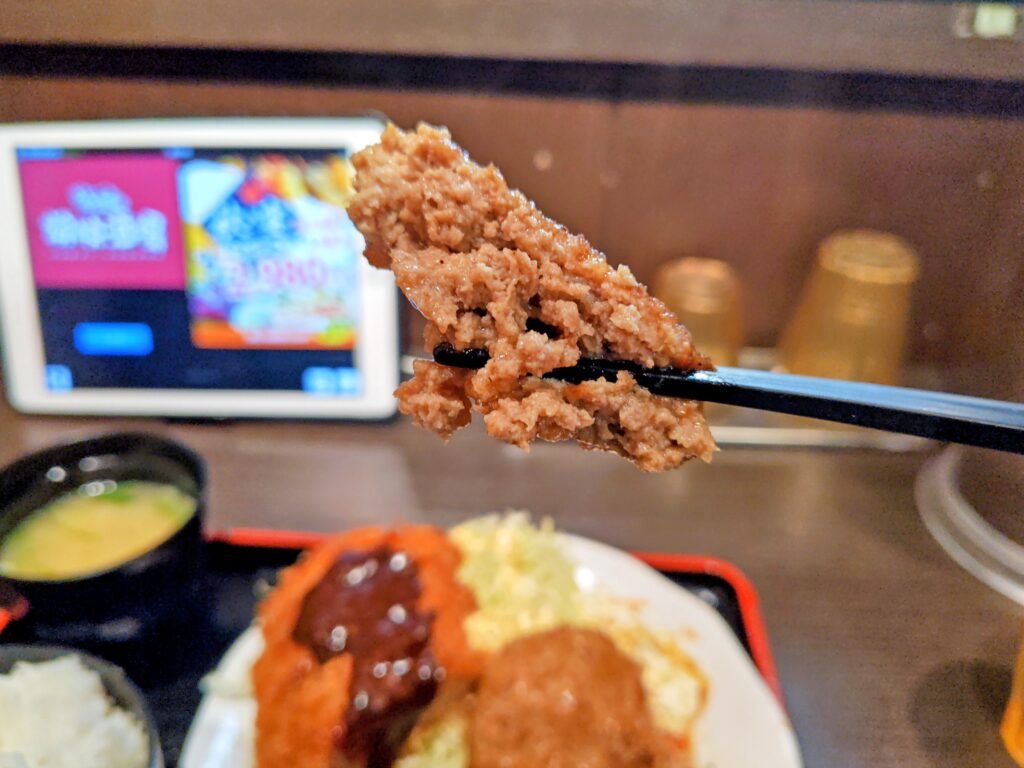 粗目のパン粉にややアッサリ目のチキンメンチ、濃厚デミソースと面白い組み合わせです。