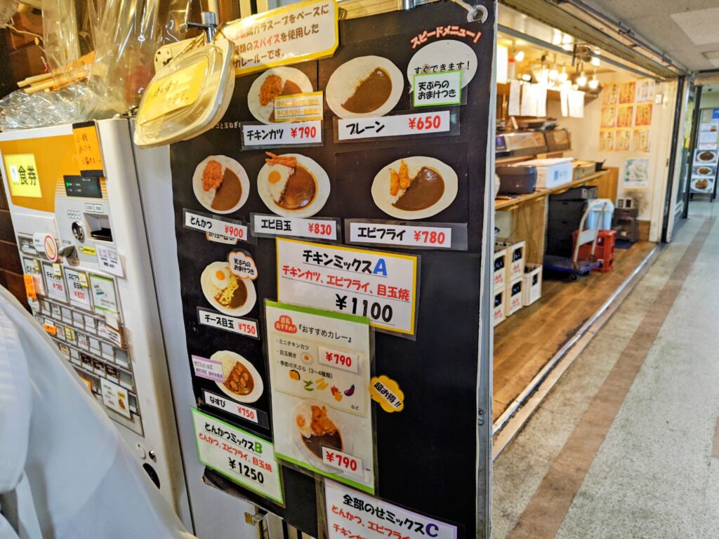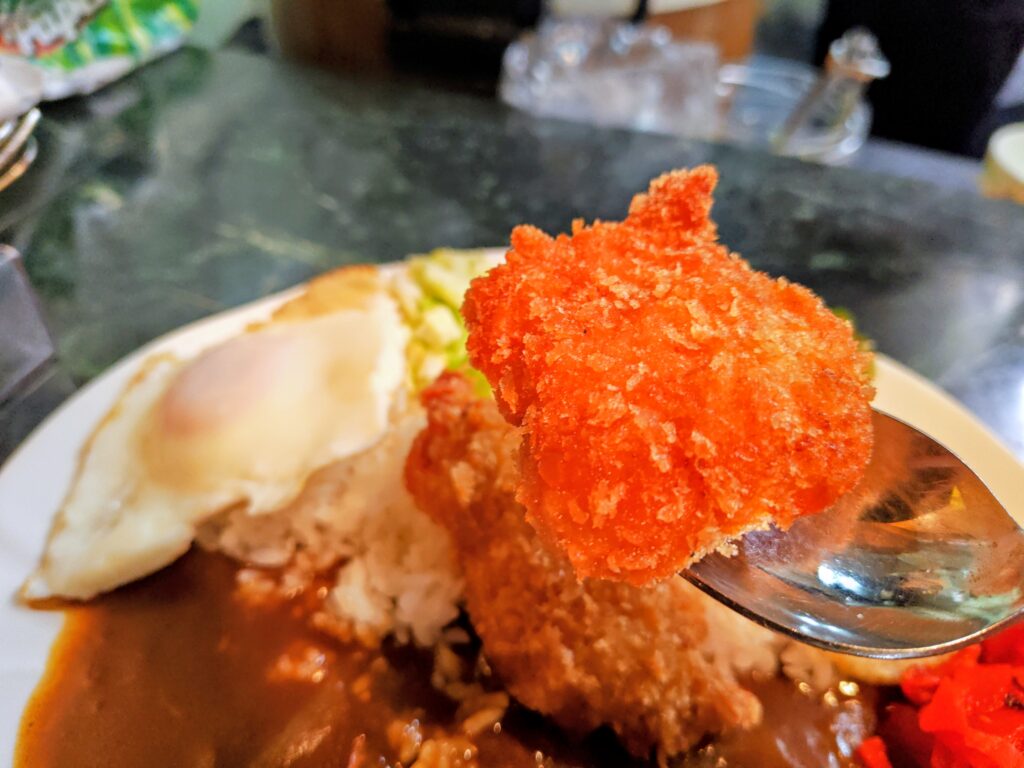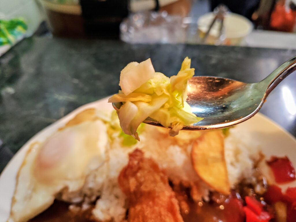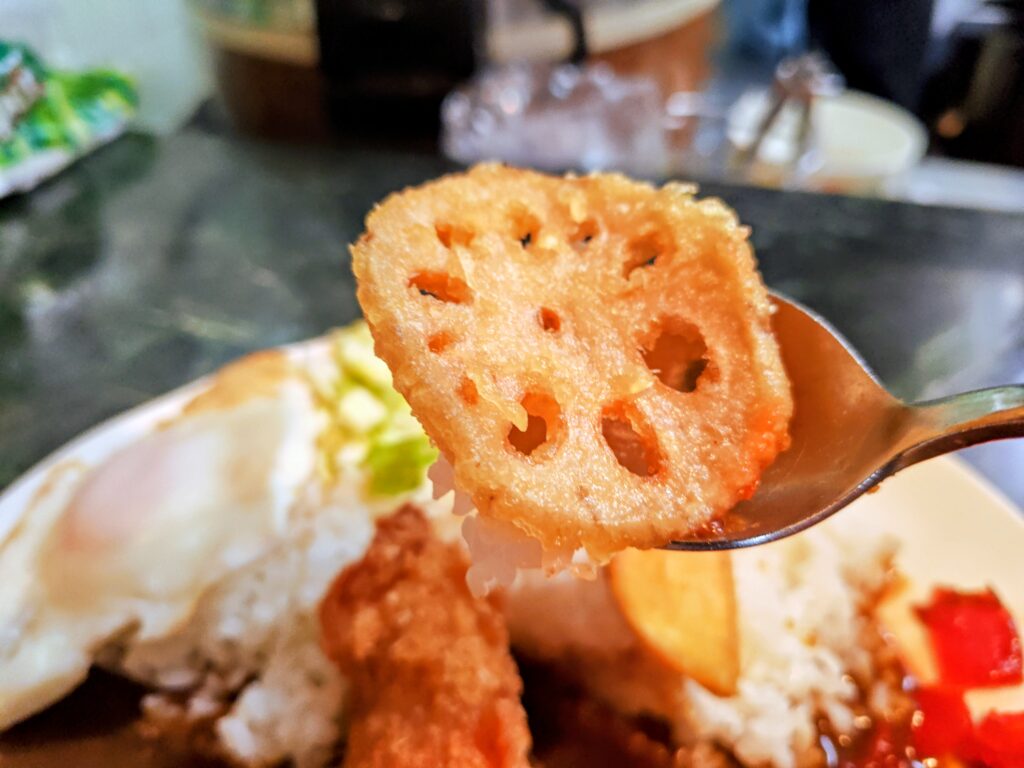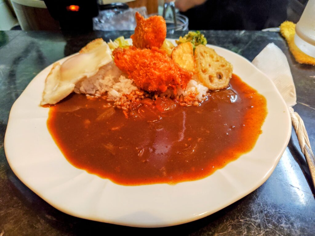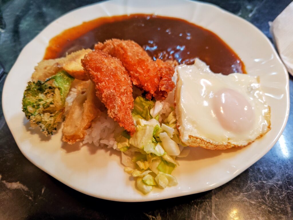 おすすめカレーはミニチキンカツ2枚、目玉焼き、季節の天ぷら3~4種、塩キャベツのトッピングです。