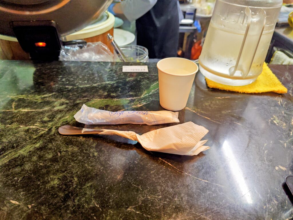 食券を渡し、席には昔ながらの紙を巻いたスプーン、お手拭き、紙コップが並べられています。