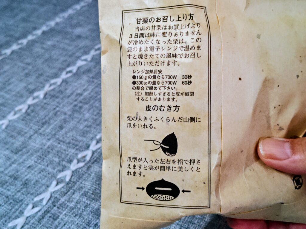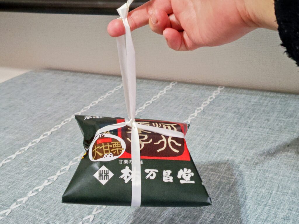 袋入り甘栗は襷掛けのビニール紐で縛られており、手提げ袋なしでも持ち運びしやすい仕様になっています。