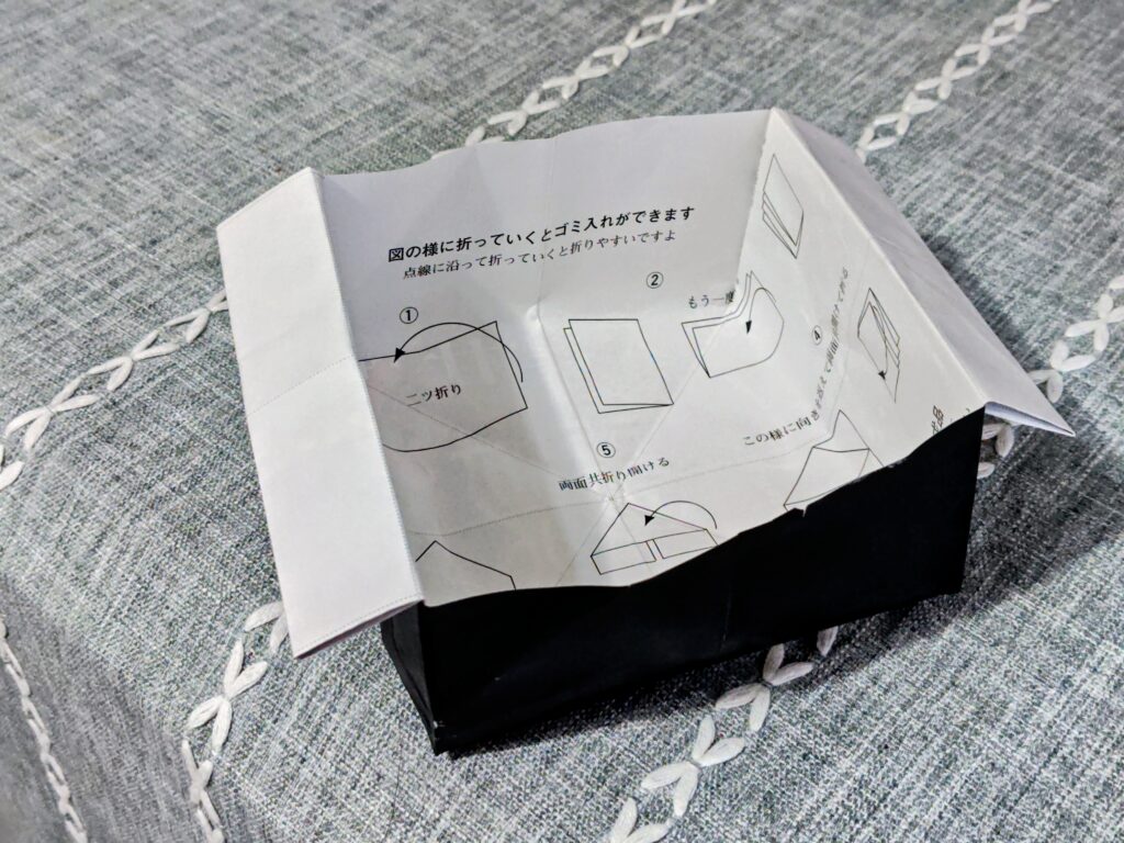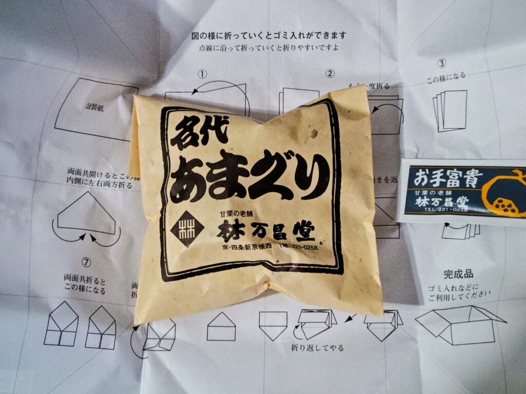 外袋は図のように折っていくとゴミ入れになり、甘栗の内袋とお手富貴がはいっています。
