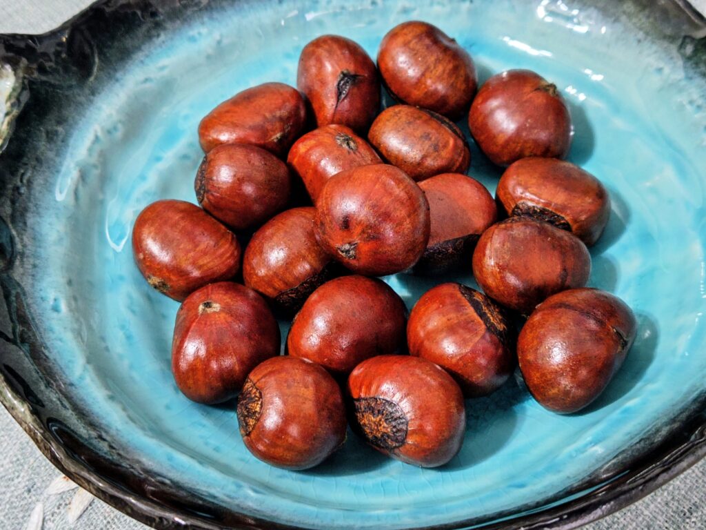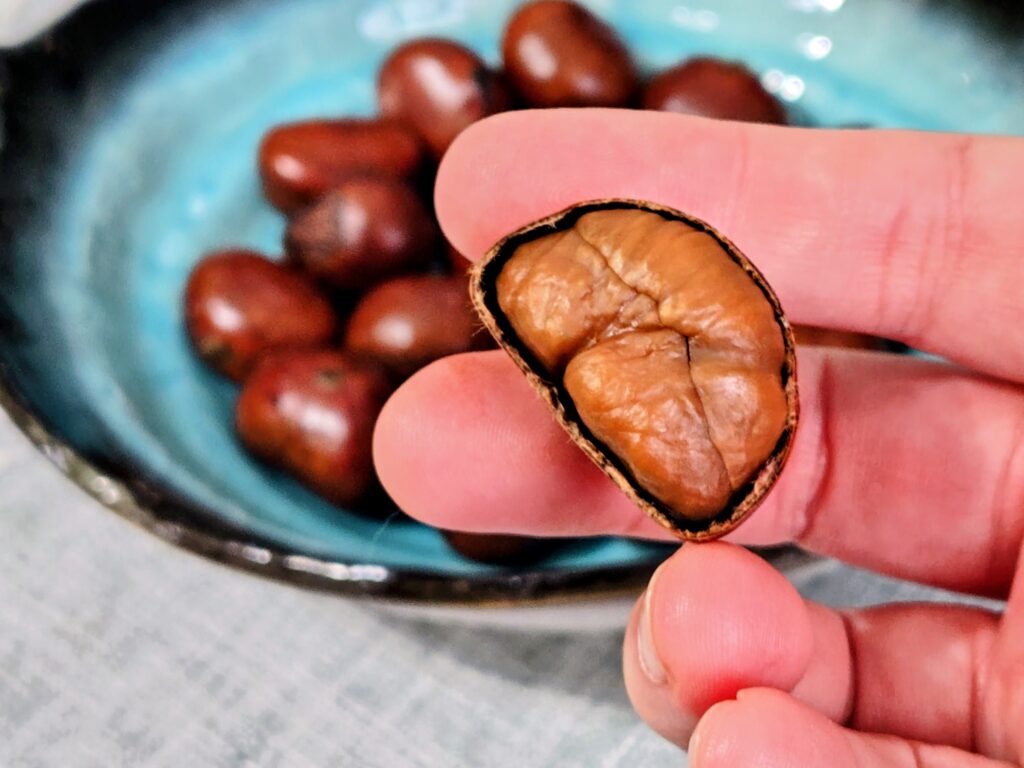 甘栗は殻付きのまま焙煎加工し販売、食用される果実の部分は殻の上からは判別出来ず。