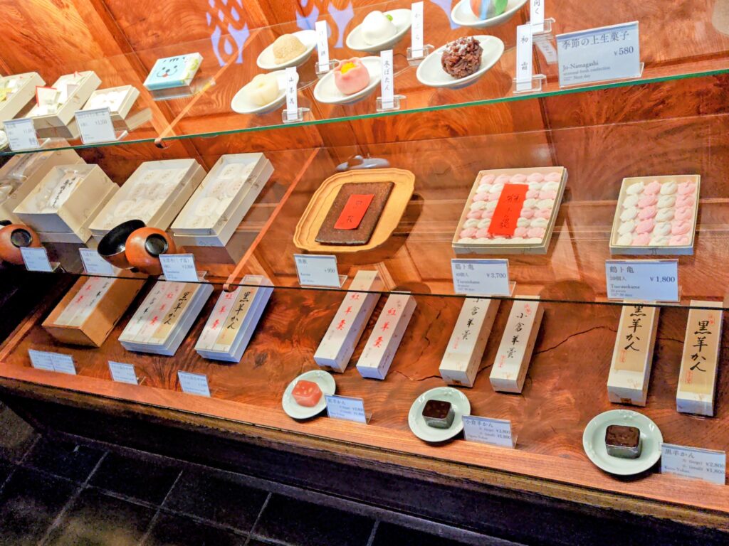 生菓子、干菓子、羊羹、上用饅頭、餅、焼き菓子のラインナップ。