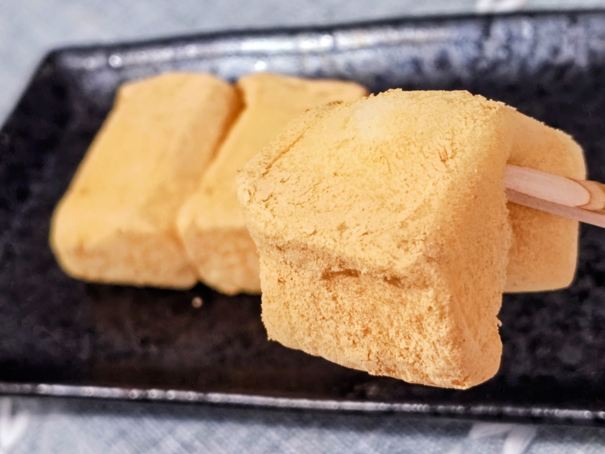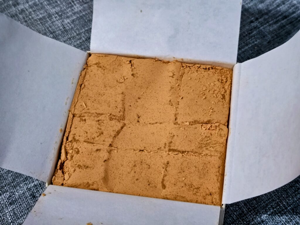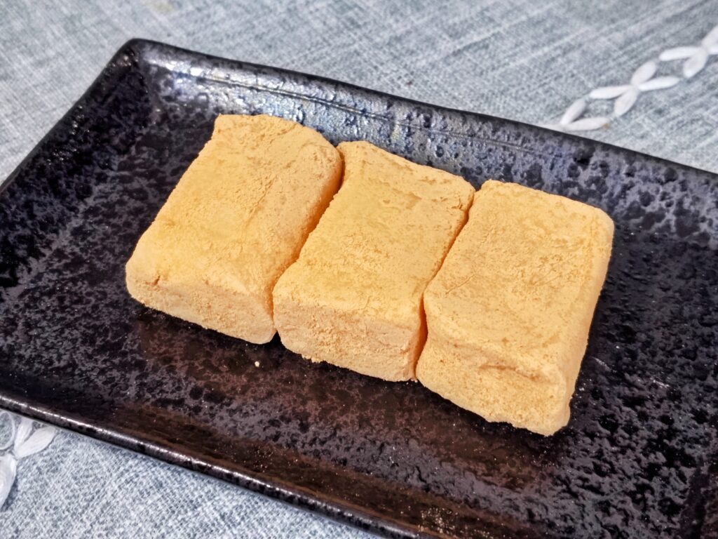 口の中にいれると柔らかくかつ弾力がある餅に香ばしいきな粉の甘みが絶妙、噛むたびに奥深い美味しさが広がる餅菓子です。