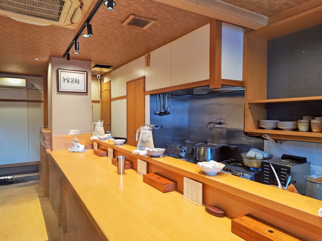 全席禁煙、全カウンター9席の白木のカウンターと白壁が調和した清潔感のある店内です。
