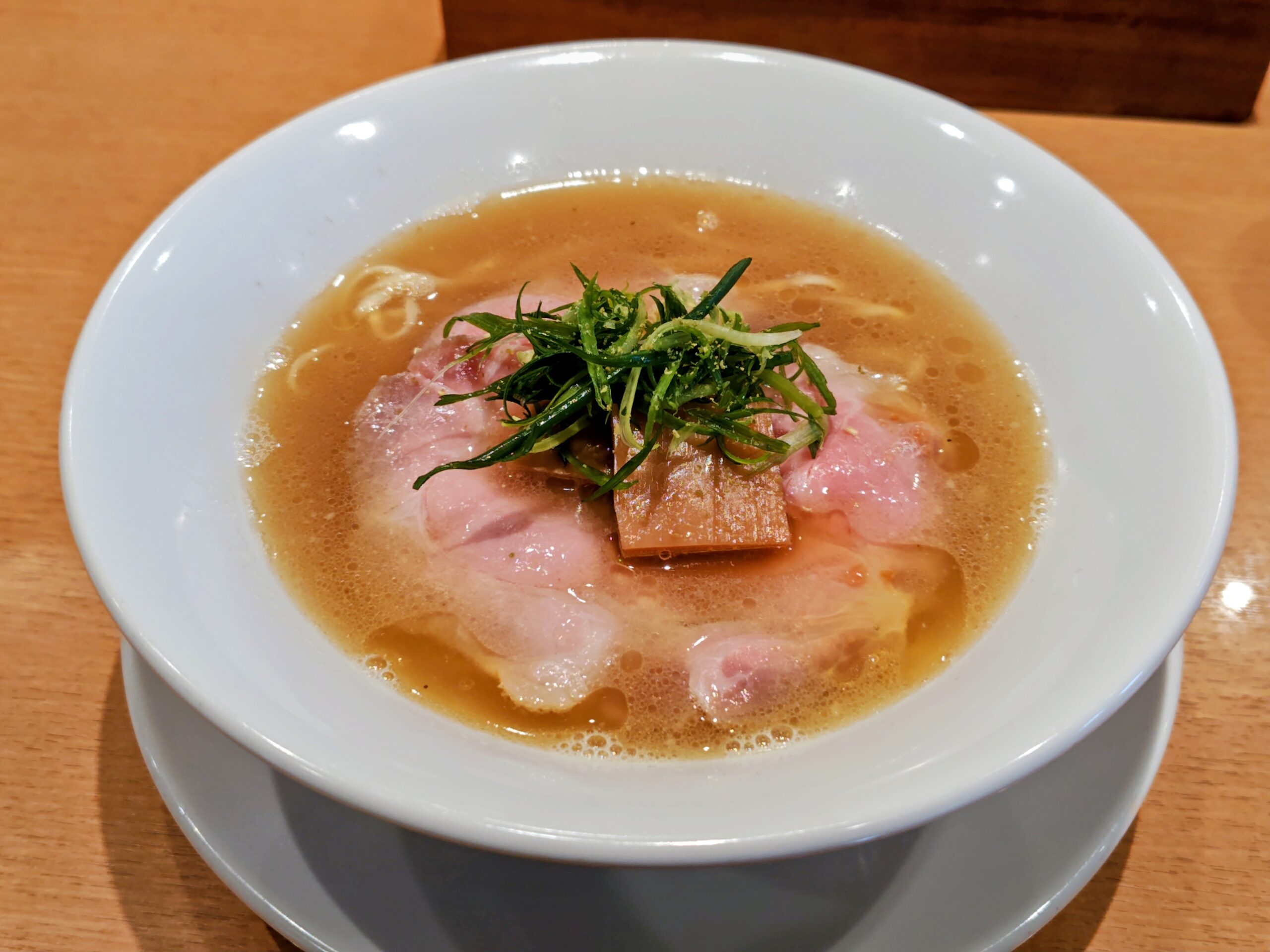 デフォの具材はシンプルに豚肩ロースレアチャーシュー、極太メンマ、九条ネギ!