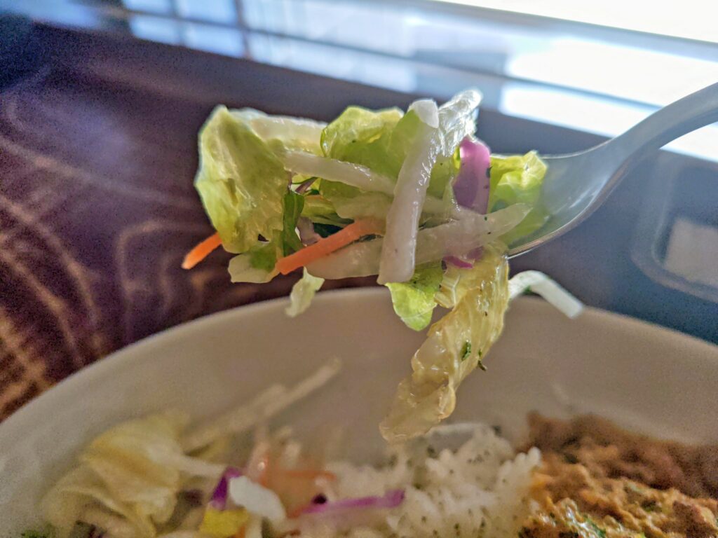 サラダはレタス、紫玉葱、人参にフレンチドレッシングの組合せ。
