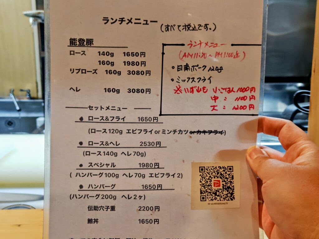 ランチメニューは11:30~13:00のサービスランチ2種(数量限定は廃止されたよう)、能登豚3種、セット4種、伝助穴子重、鮪丼のラインナップ!