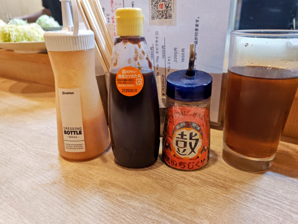 卓上にはデミいちじくソース、味噌カツソース、自家製フレンチドレッシングが置かれています。
