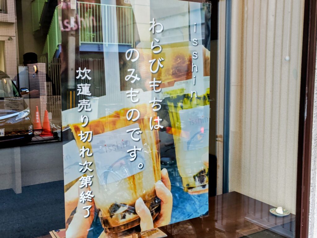お店前には『わらび餅はのみものです。』のポスターあり。