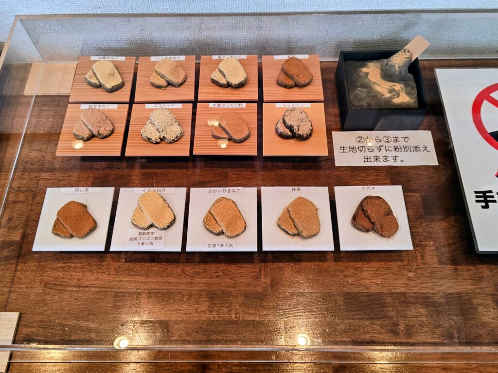 定番の味は手前の5種(焙じ茶、くるみねり、ふかいりきなこ、抹茶、カカオ)に加え、この日の季節の限定品が8種。