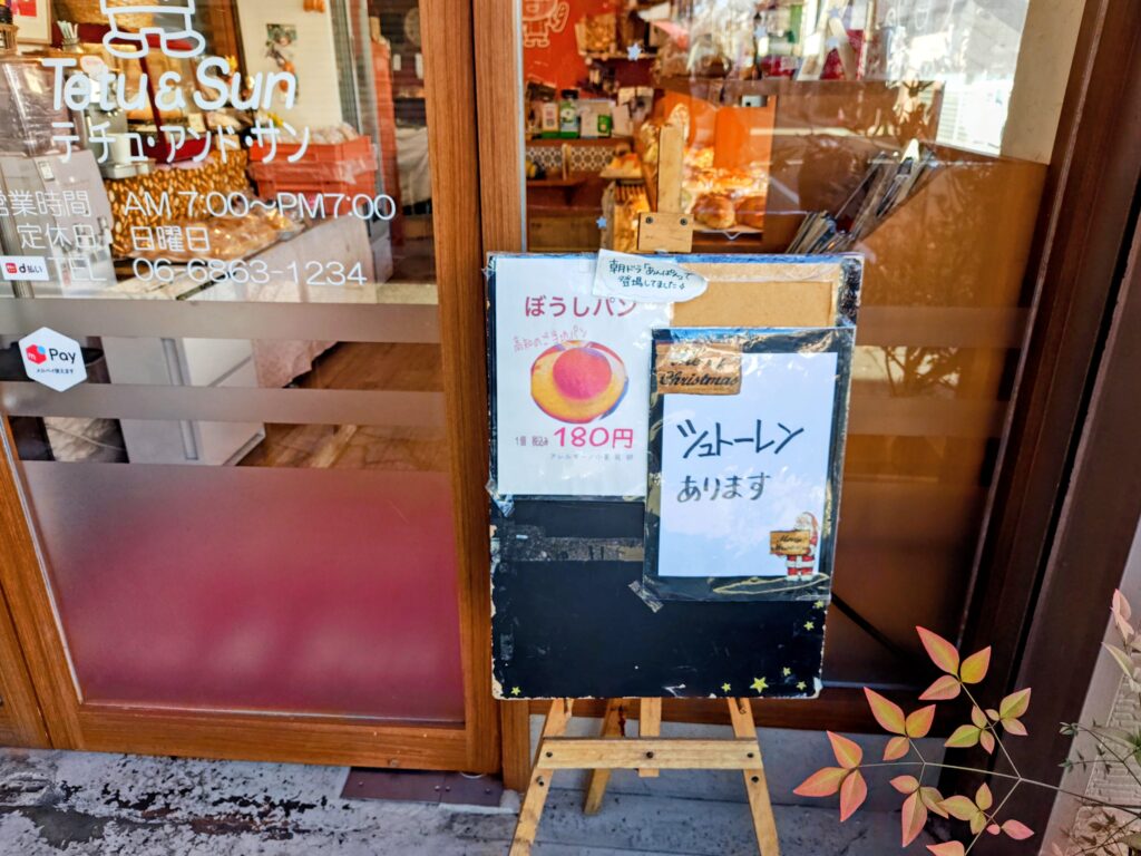 お店前には季節のシュトーレン、高知のご当地パンぼうしパンの告知があります。