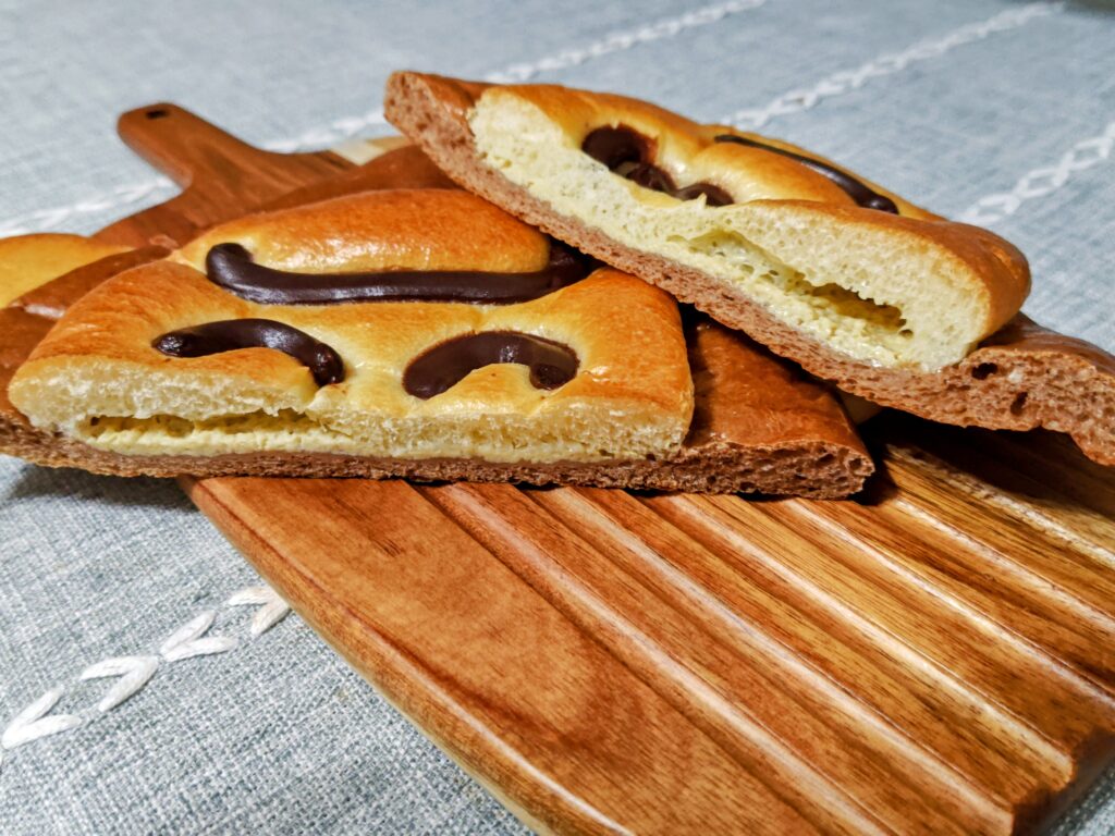 顔の外側の茶色は黒糖パン、顔は通常のパンの中に自家製バナナクリームをイン!