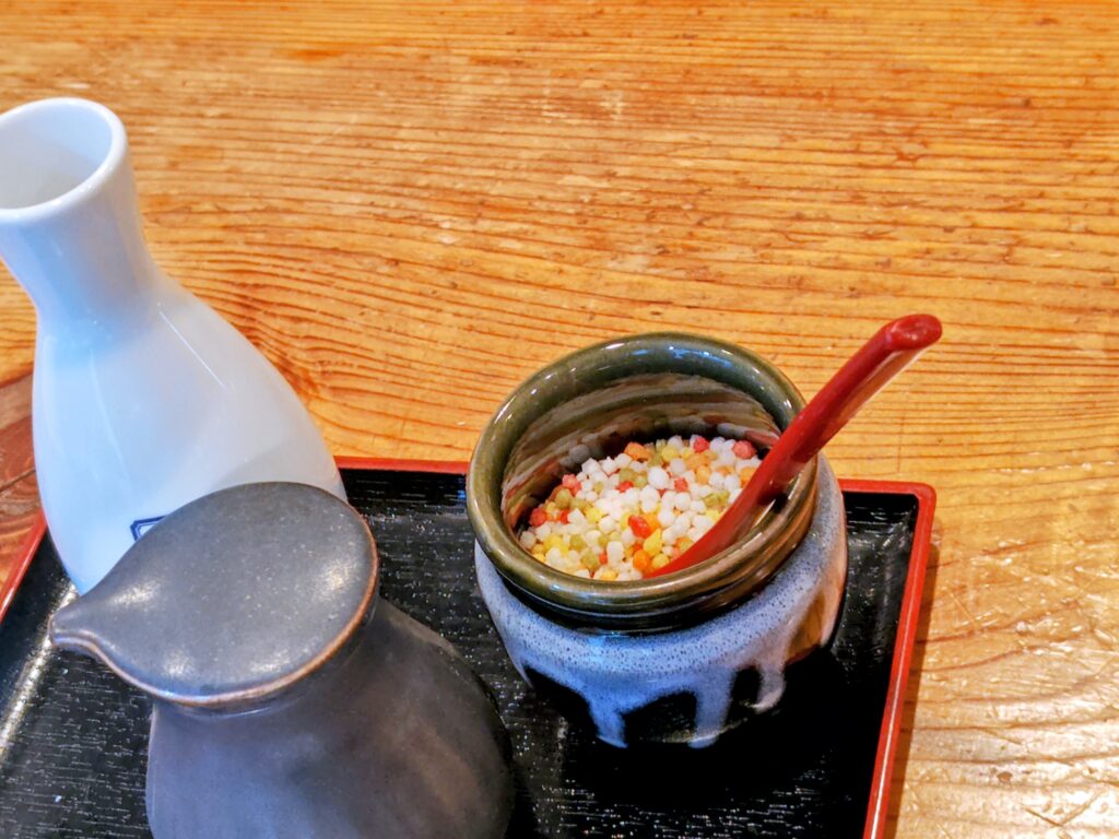 卓上には醤油、出汁茶漬け用あられ、胡麻ダレがあります。