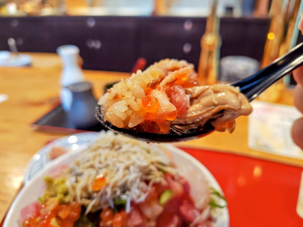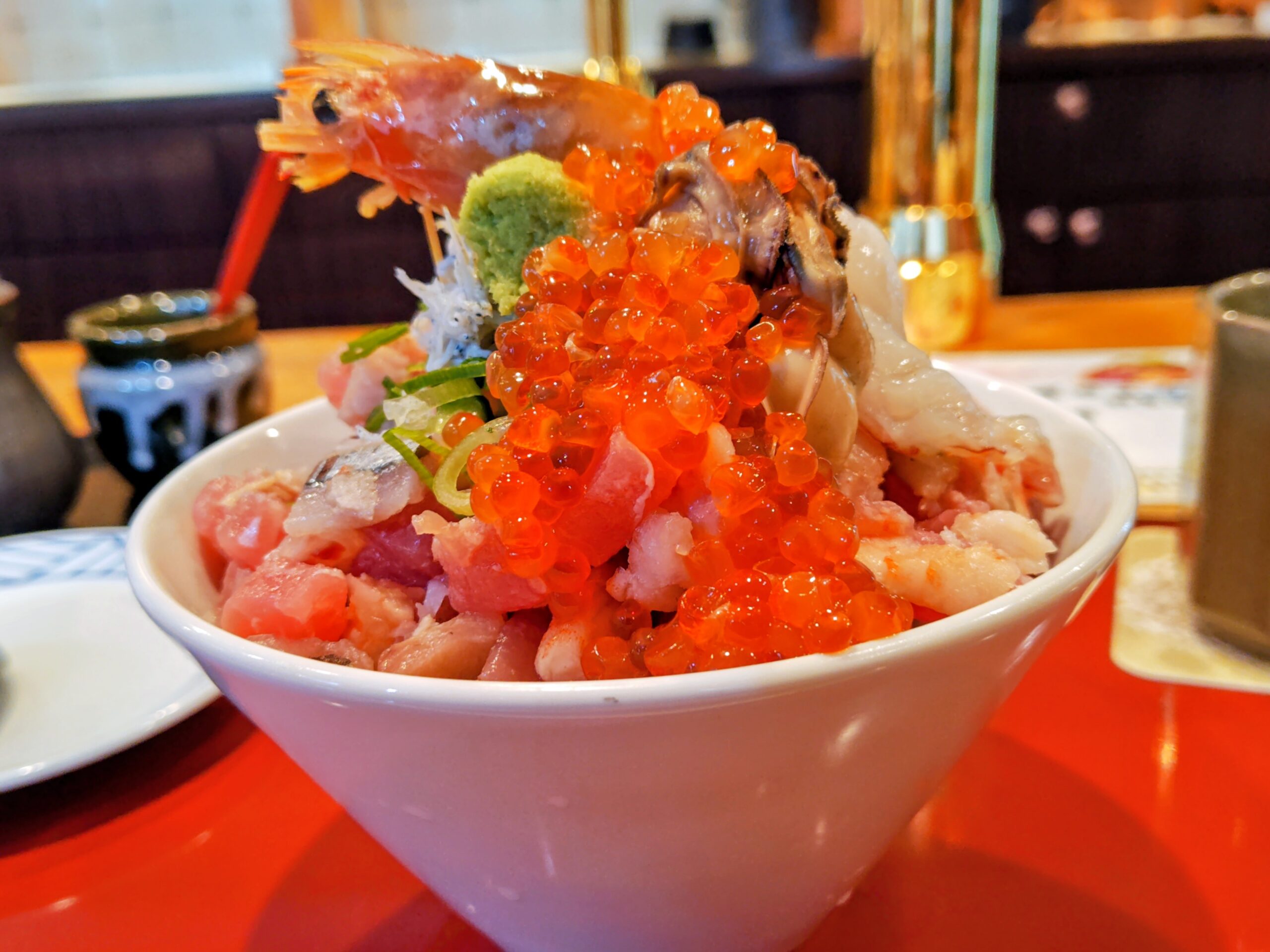 この海鮮丼は『たくさん海鮮を頬張って満足してほしい』と思い営業しております。
