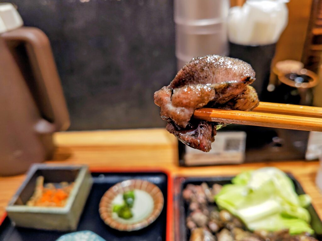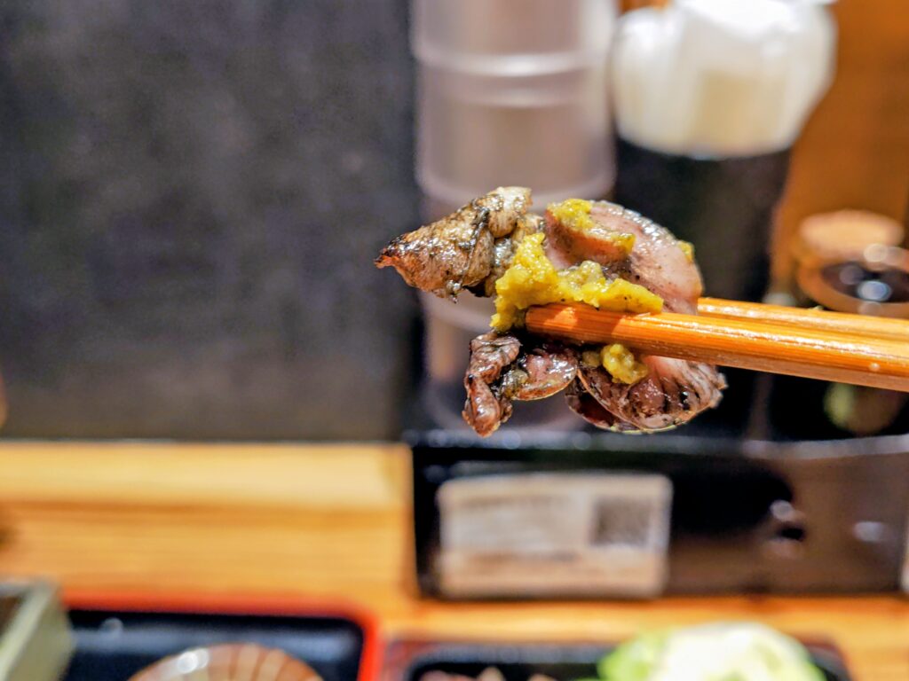 小口切りにした地鶏を塩胡椒で下味をつけ、強火の炭火で炭の色が付くまで黒々とこんがり焼き上げられ、そのままでも旨く柚子胡椒も凄くあります。
