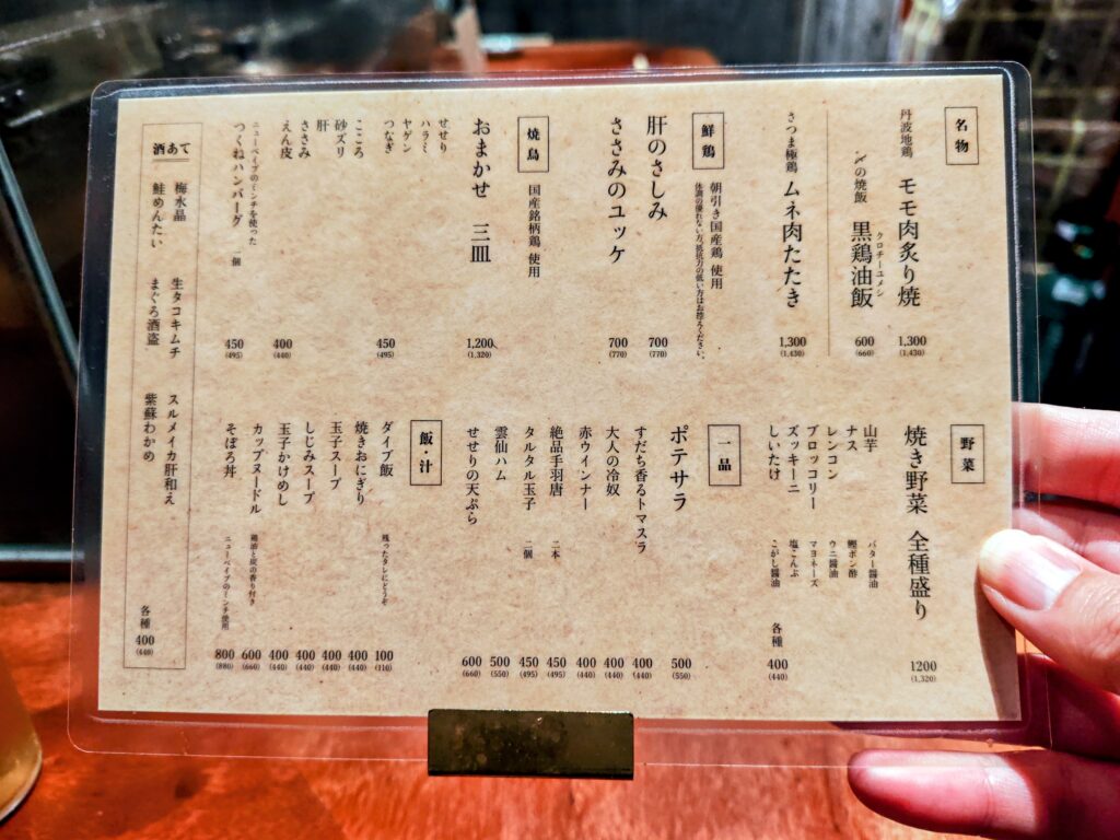 フードメニューは名物3品(※黒鶏油飯はモモ肉炙り焼きをオーダーした場合のみ)、鮮鶏、焼鳥、野菜、一品、飯・汁、アテに黒板です。