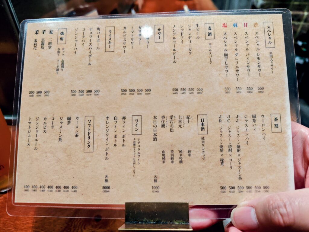 ドリンクメニューはスペシャル(果肉入りサワー)、麦酒、サワー、ウイスキー、焼酎、茶割、日本酒、ワイン、ソフトドリンクのランナップ。