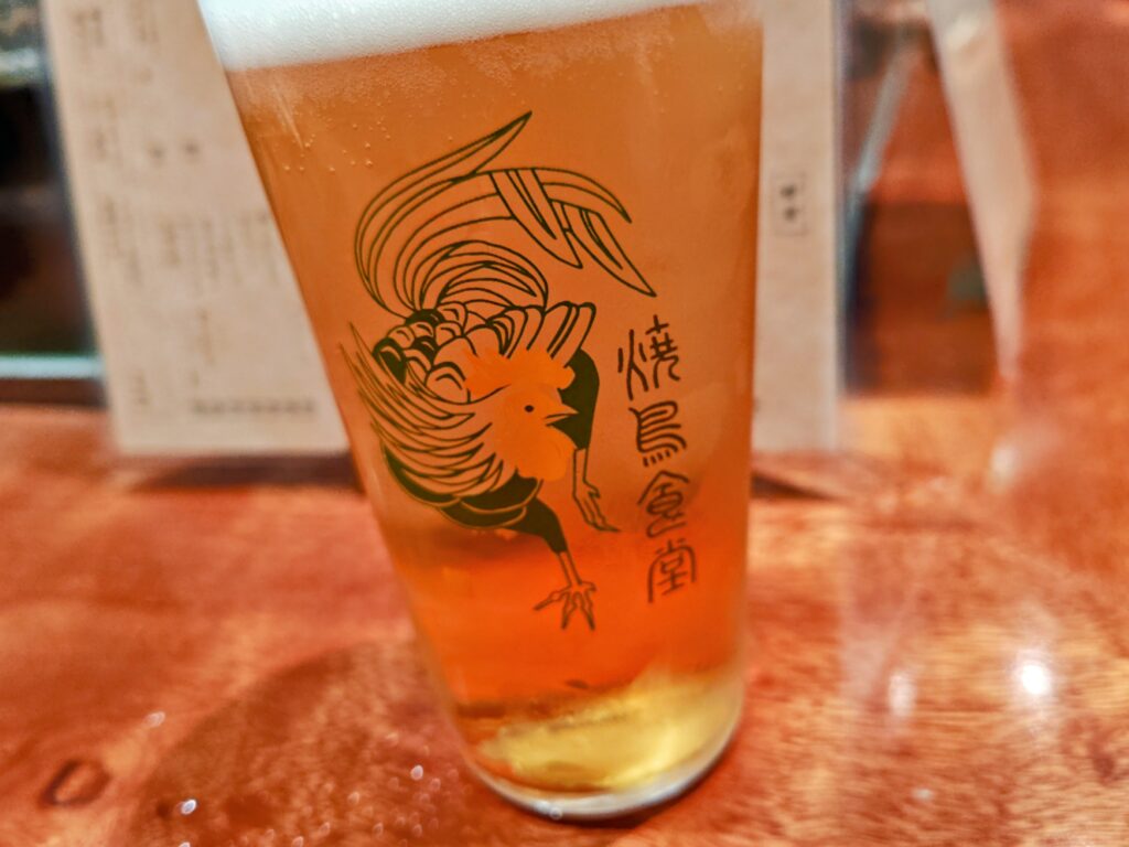 焼鳥食堂さんのロゴの入ったグラスで一期一会に乾杯。