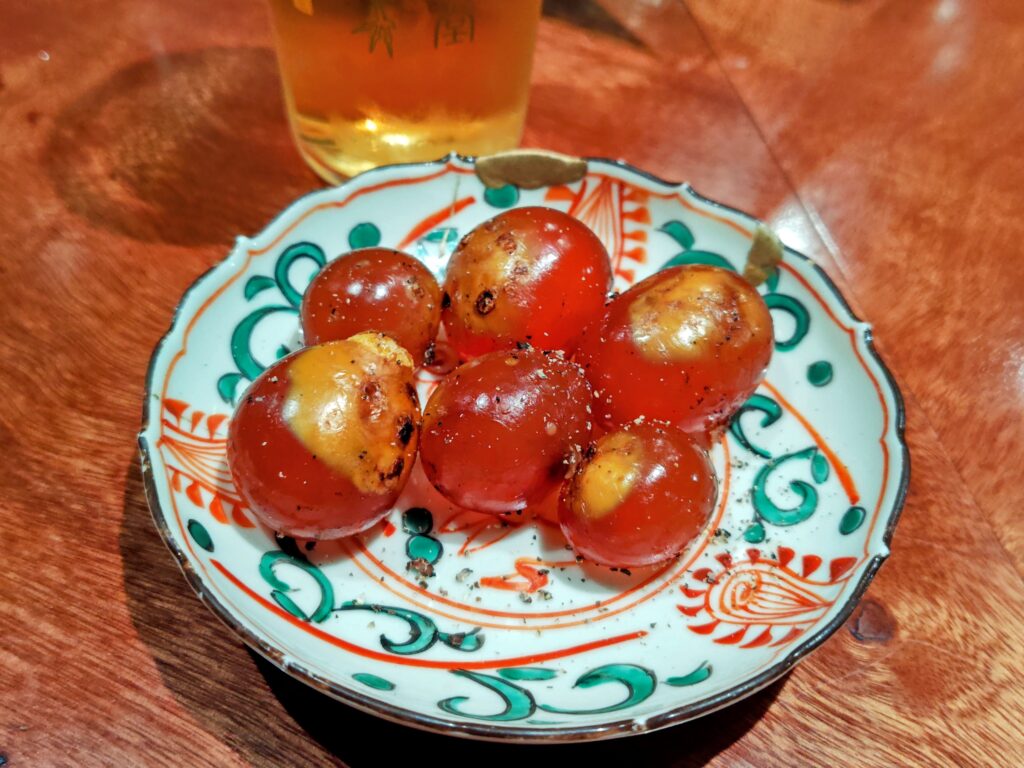 生のキンカンを特製の醤油ダレで漬け込み軽く炙ってホール胡椒を削っての提供でプチッと濃厚な旨味が口の中に広がります。