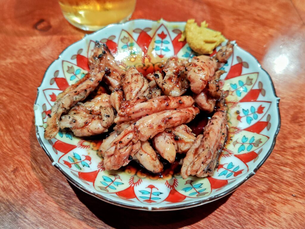 辛子が添えられ絶妙な火入れ具合、ぷりぷり食感に濃い目のタレとお酒が進む焼鳥です。