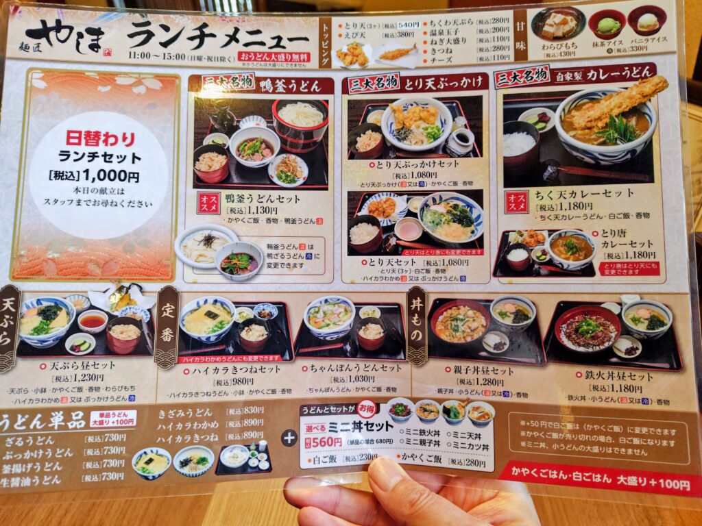 ランチタイム以外も定食があり、三大名物、温かいうどん、冷たいうどん、なべ焼きうどんとお腹具合で色々と選べるようになっています。