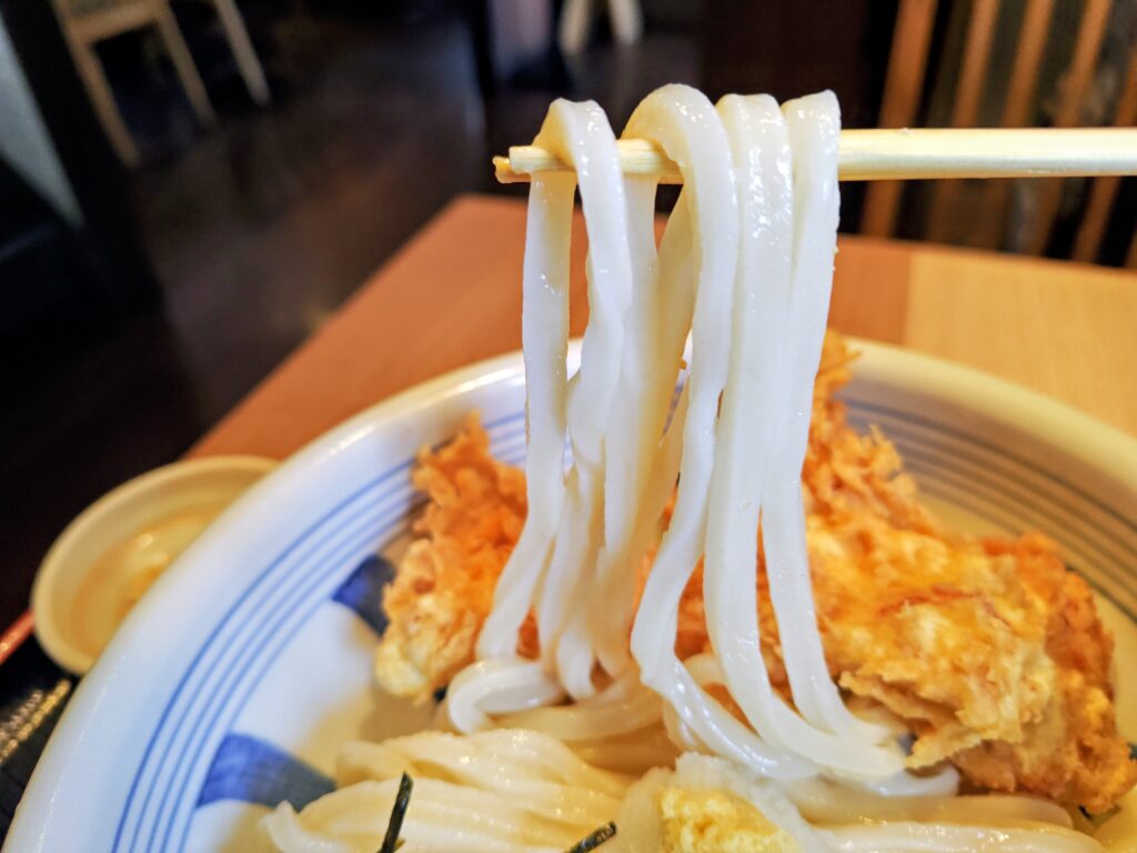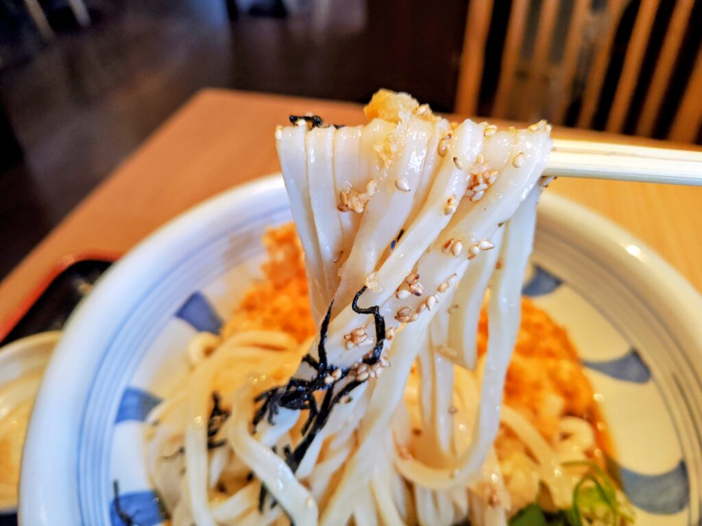 打ち立て茹で立てをしっかり冷水で〆られたうどんは中細は喉越しよくモチモチ食感です。