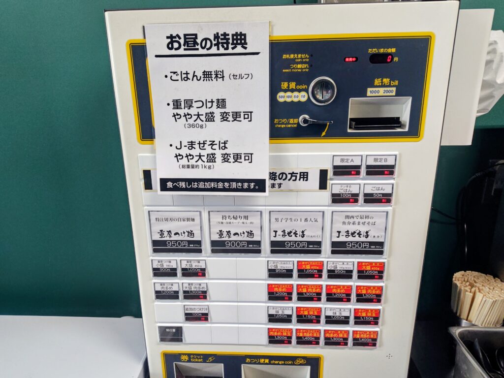 お昼の特典は・ご飯無料(セルフ)・重厚つけ麺やや大盛(360g)変更可・J-まぜそばやや大盛(総重量約1Kg)変更可※食べ残しは追加料金を頂きます になっています。