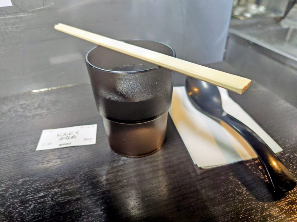 水はセルフでウォーターサーバー横に割箸、プラコップ、レンゲ紙があります。