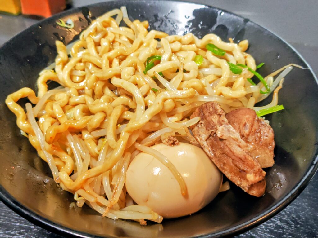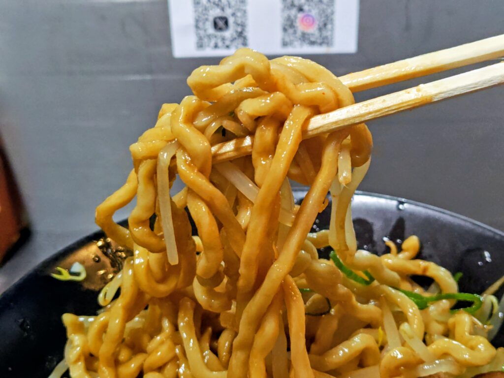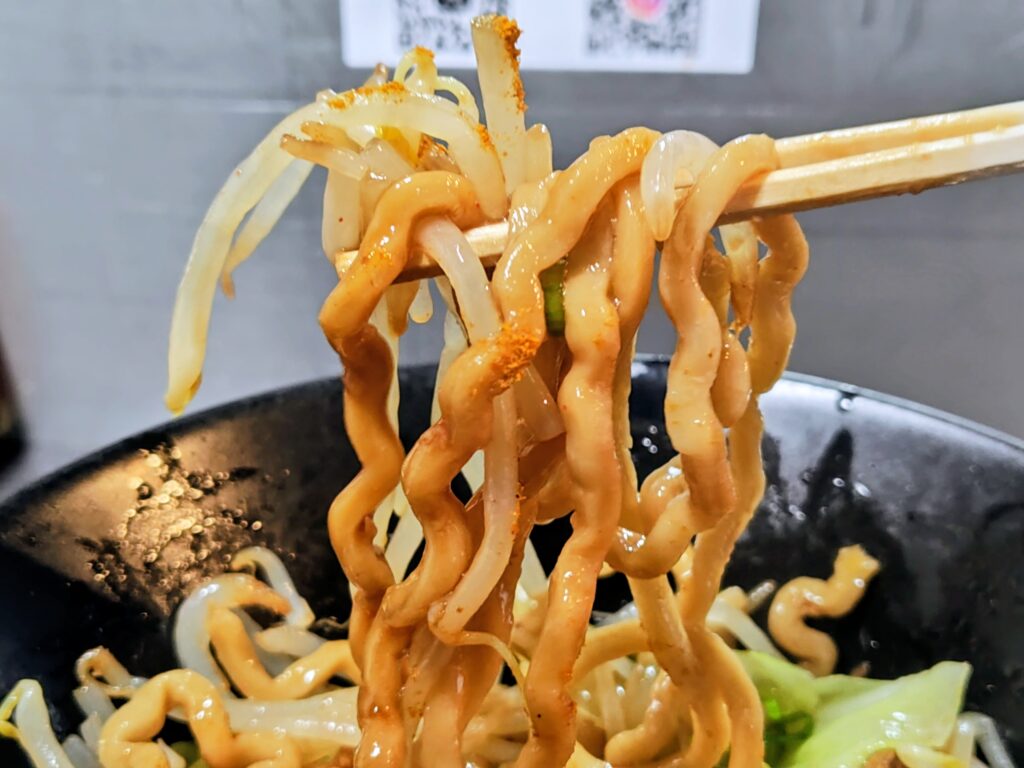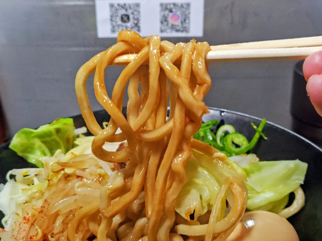 ウェーブのかかった極太麺!ムチムチ弾力の食感で、混ぜなくてもしっかり特製タレに絡んでいます。