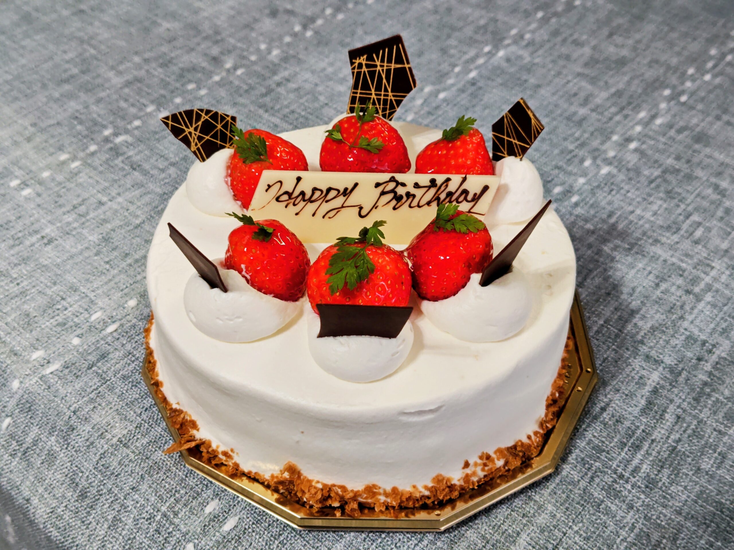 ホールケーキはシンプルに苺がサークル状に並べられチョコレートとホワイトチョコレートのネームプレートが目を引きます。