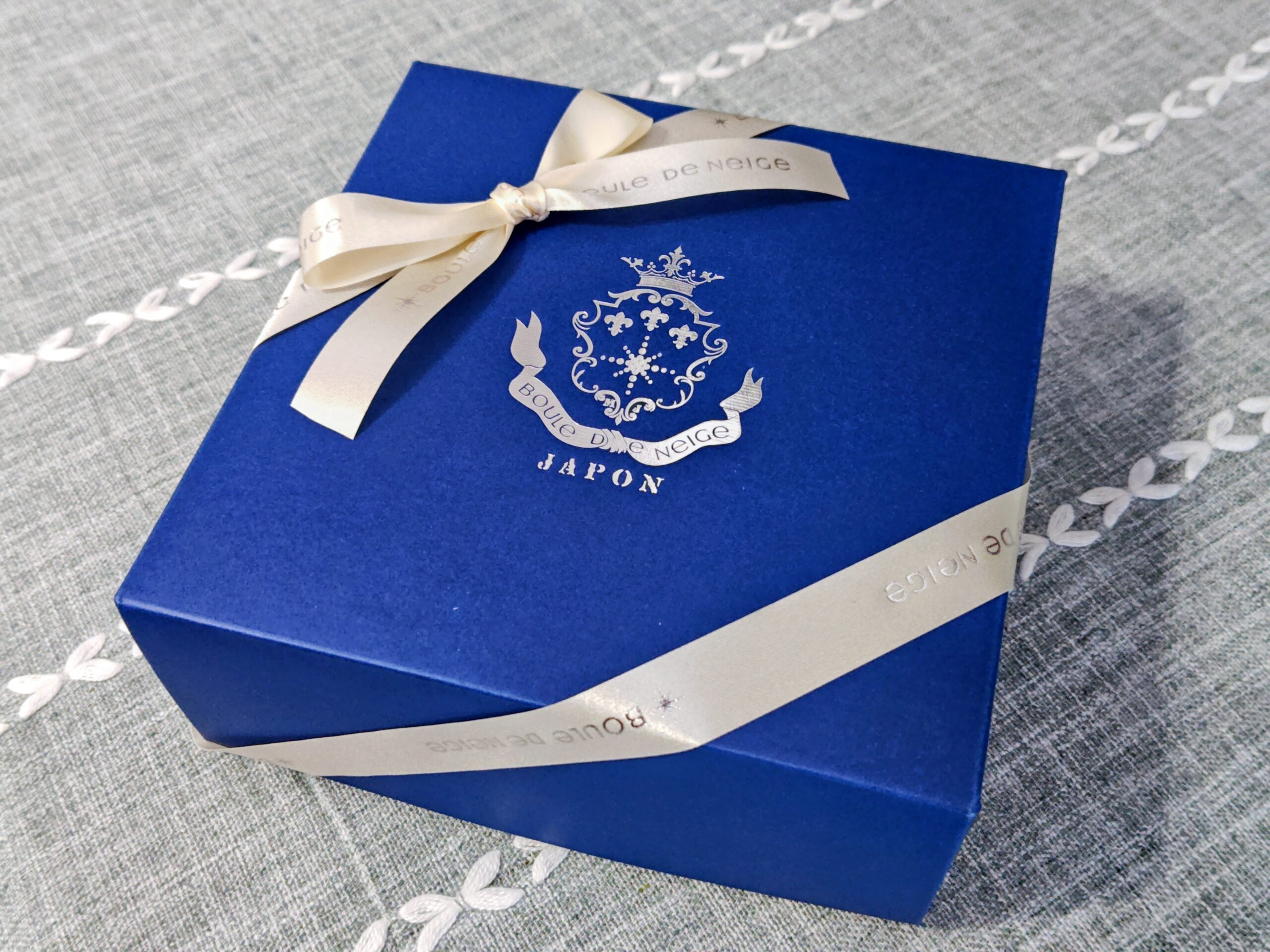 BOXは美しいブルーにシルバー文字にシルバーのリボン!