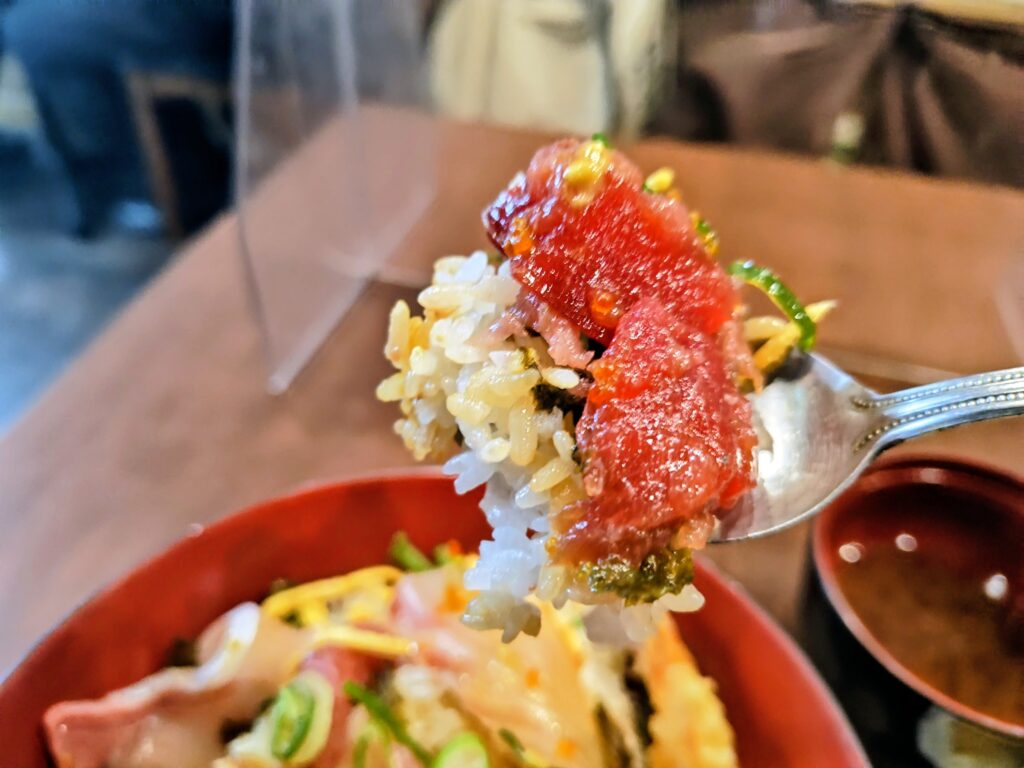 赤出汁を啜り、海鮮丼ぶりを頂く幸せの完食です。