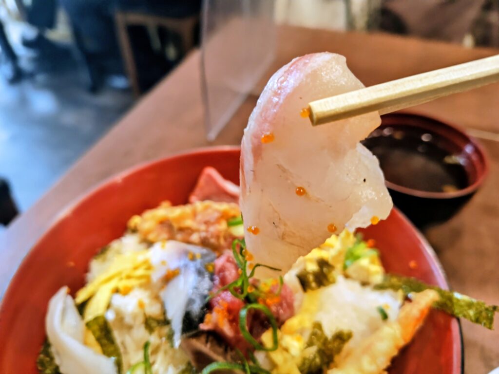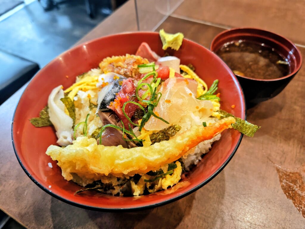 今日の海鮮丼の具材は、真鯛、鮪、鰹、しめ鯖、タコ、海老天、竹輪天!