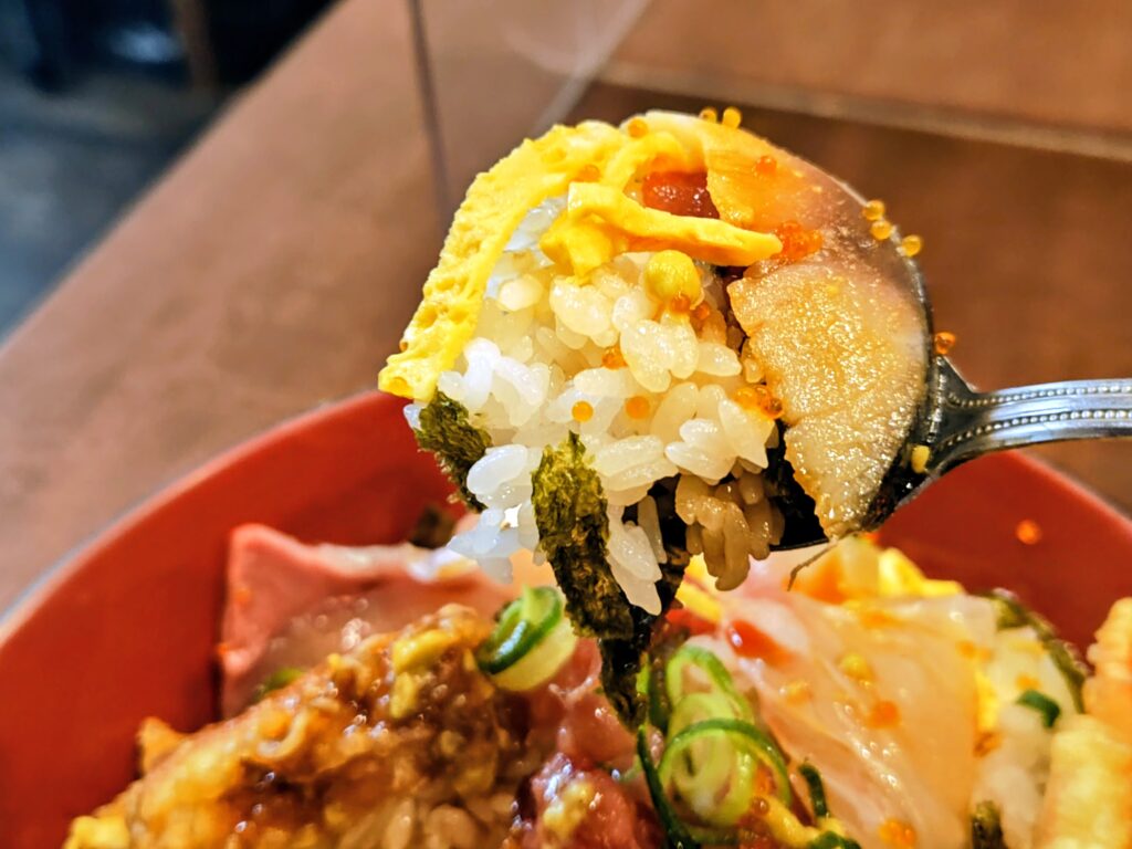 具材の下には錦糸卵、刻み海苔、硬めのご飯がしっかりあり!