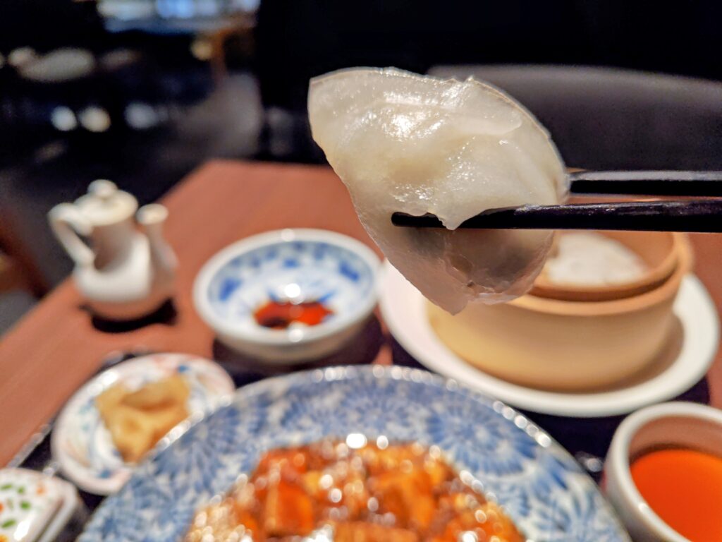 同時に提供される黒酢と一緒に。蒸したて肉汁たっぷりとミシュランクオリティー!