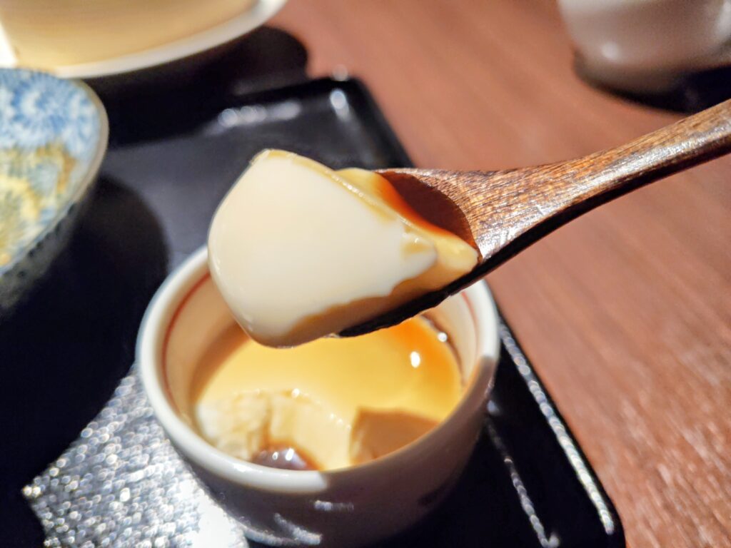 黒蜜がかかった杏仁豆腐はとてもクリーミーで滑らか!