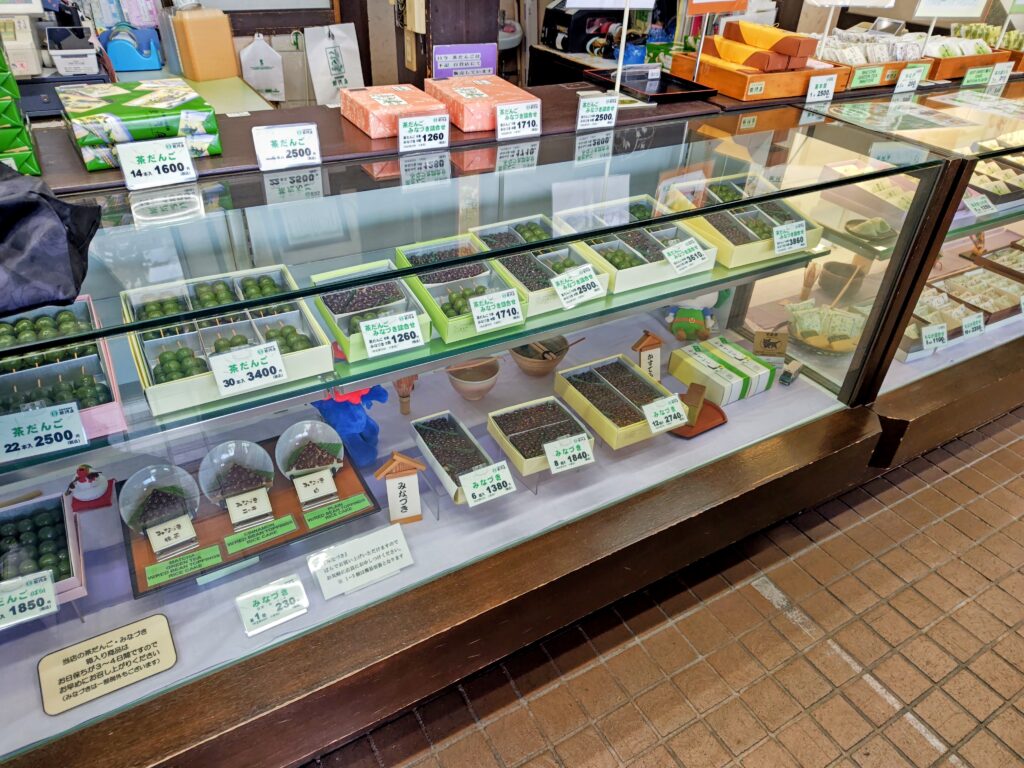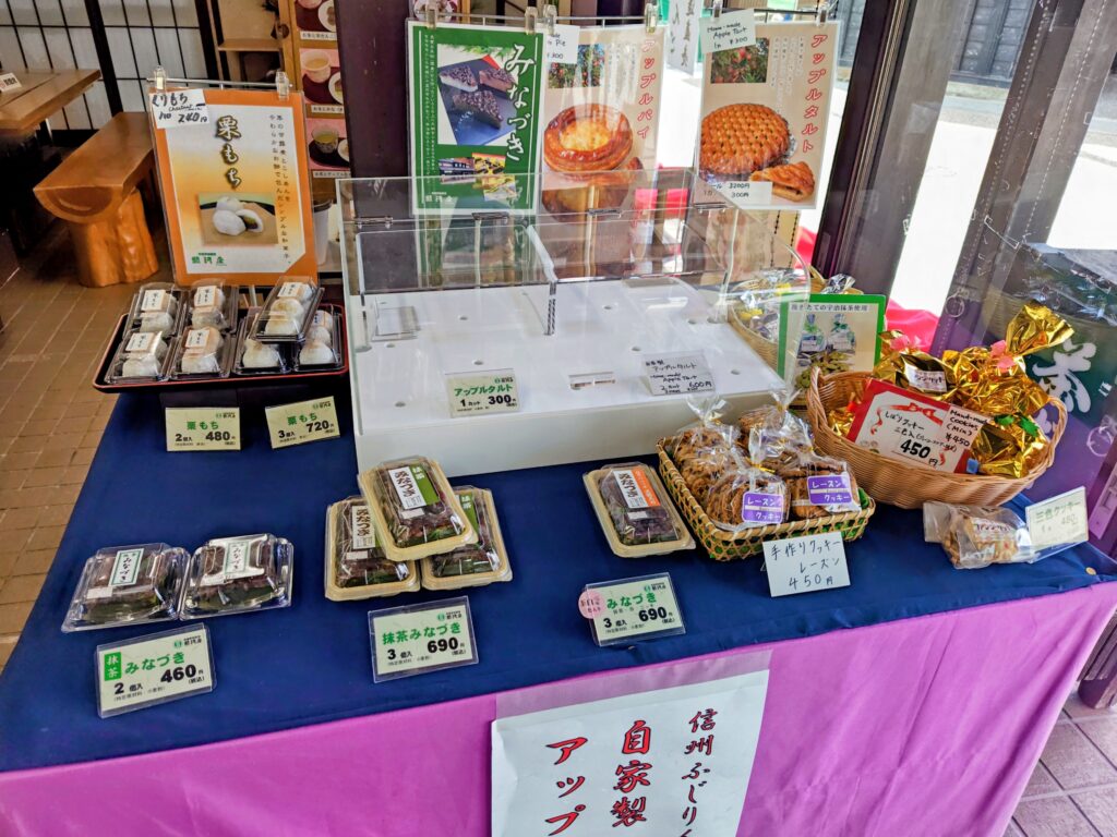 商品は茶だんご、みなつき、ようかん、もなか、宇治抹茶クッキー、アップルパイ等。