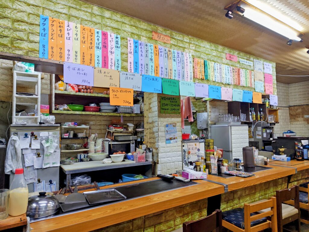 全席喫煙可、全テーブル20席(カウンター席は使っていない感じ)カラフルなメニュー手書きが印象的な店内です。
