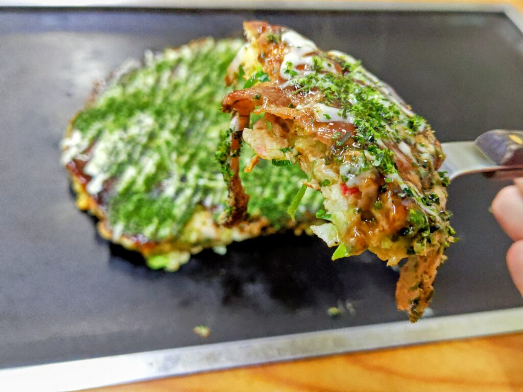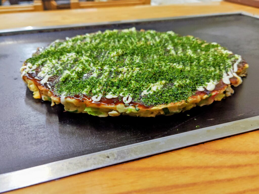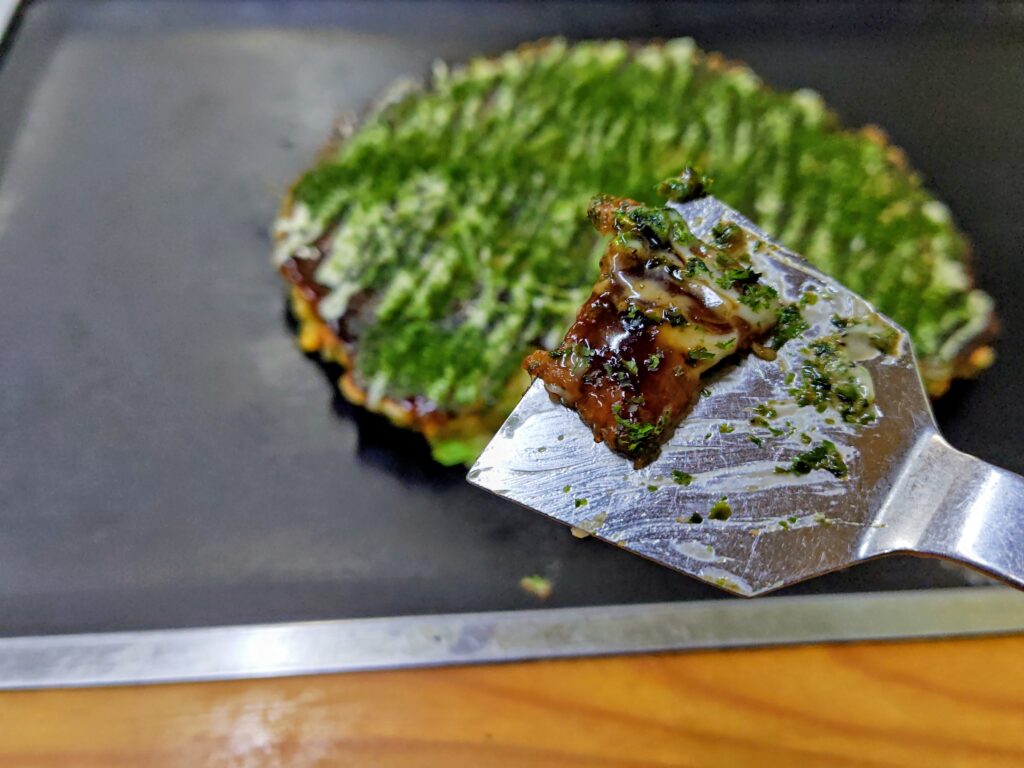 ソースとマヨネーズそして鮮やかな青海苔がのるお好み焼き!
