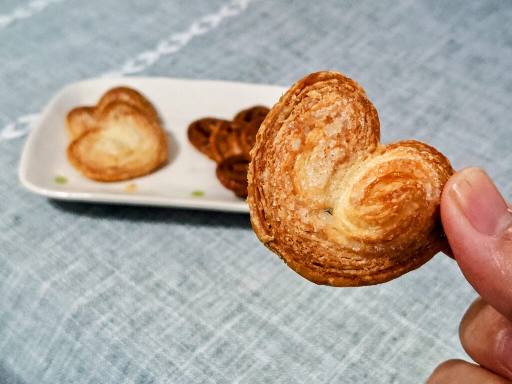 パルミエ(Palmier)は、フランス発祥のハート型(またはヤシの葉型)をしたパイ菓子でパイ生地に砂糖をまぶして折り込み、焼き上げたもので、『ヤシの木(シュロ)』を意味し、その形が由来です。
