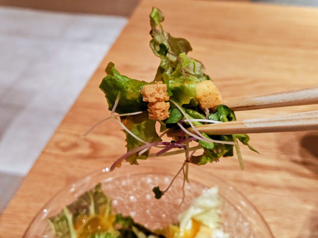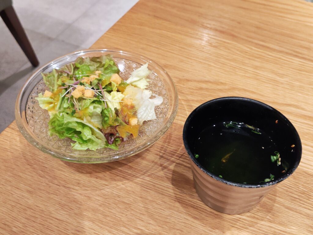 サラダはレタスにカイワレとクルトンのり食感とドレッシングの酸味がよいです。