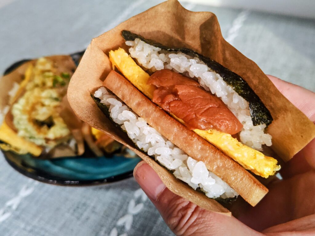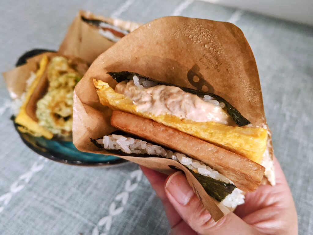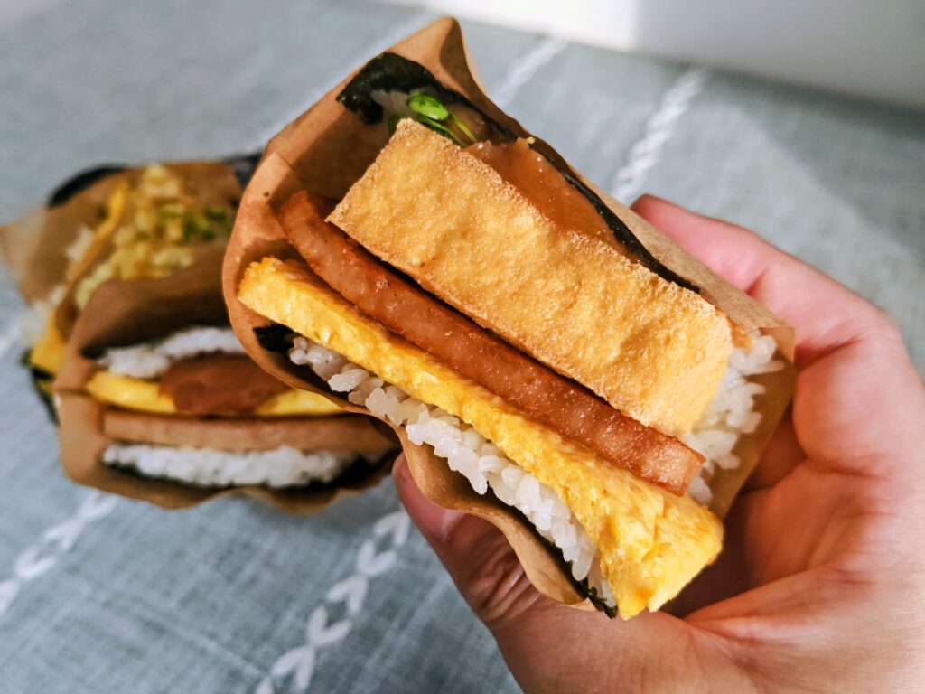 ご飯は精米4日以内の米だけ使用、間にオリジナルポークと玉子焼き、硬めの海苔でU字に巻かれています。