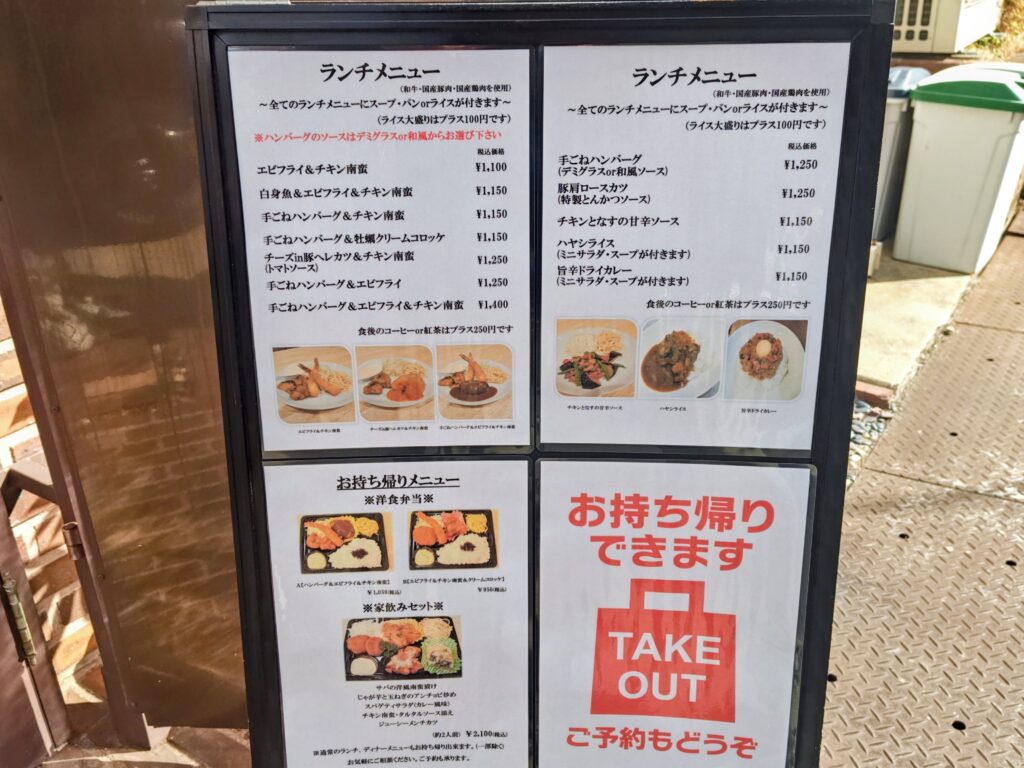 ランチメニューは手ごねハンバーグ、チキン南蛮、エビフライ等の組合せにハヤシライス、旨辛ドライカレー!