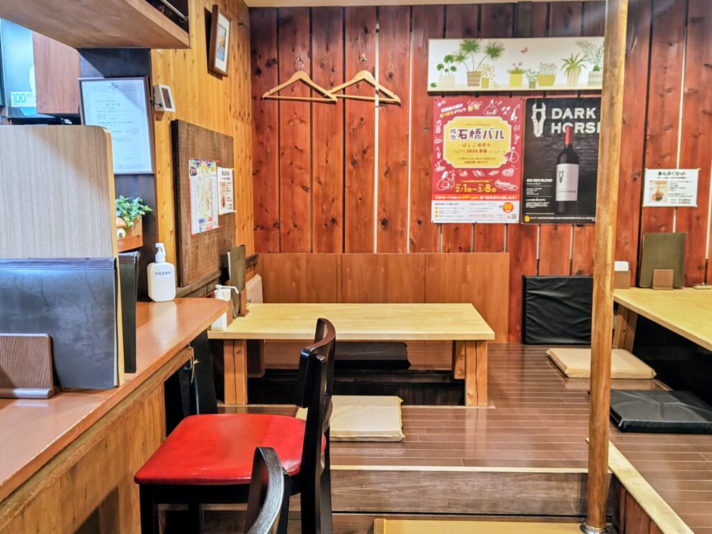 全席禁煙、手前にカウンター席、奥に堀炬燵席があるウッディな店内です。