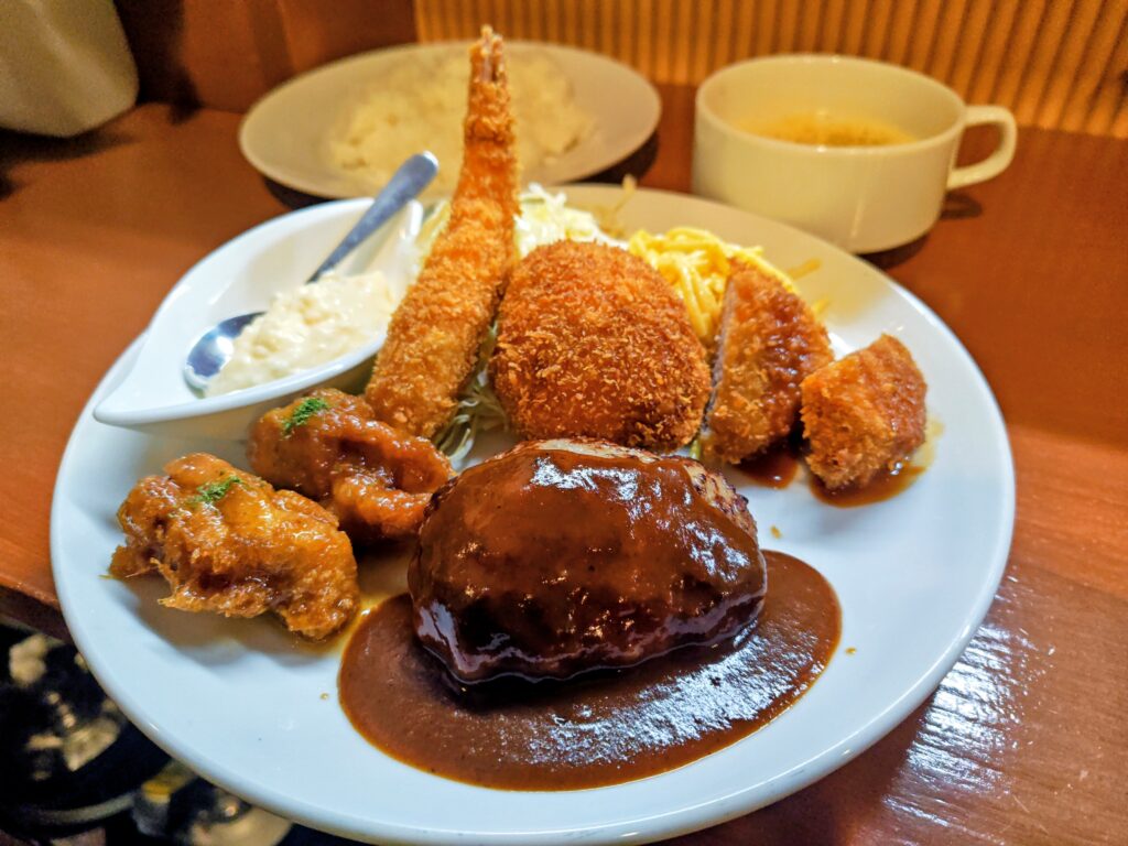 まんぷくセットは手ごねハンバーグ、エビフライ、チキン南蛮、クリームコロッケ、トンカツ、スープ、サラダ、ご飯