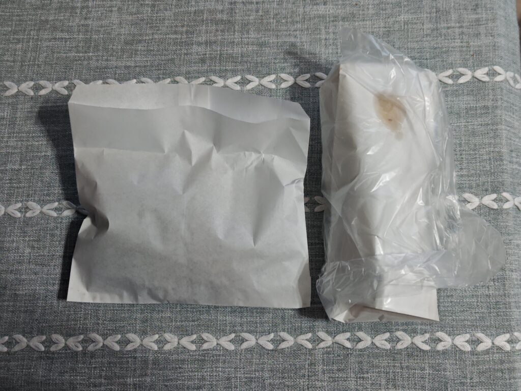 ウッフは紙包装に滲むため更にナイロン包装がプラスされています。