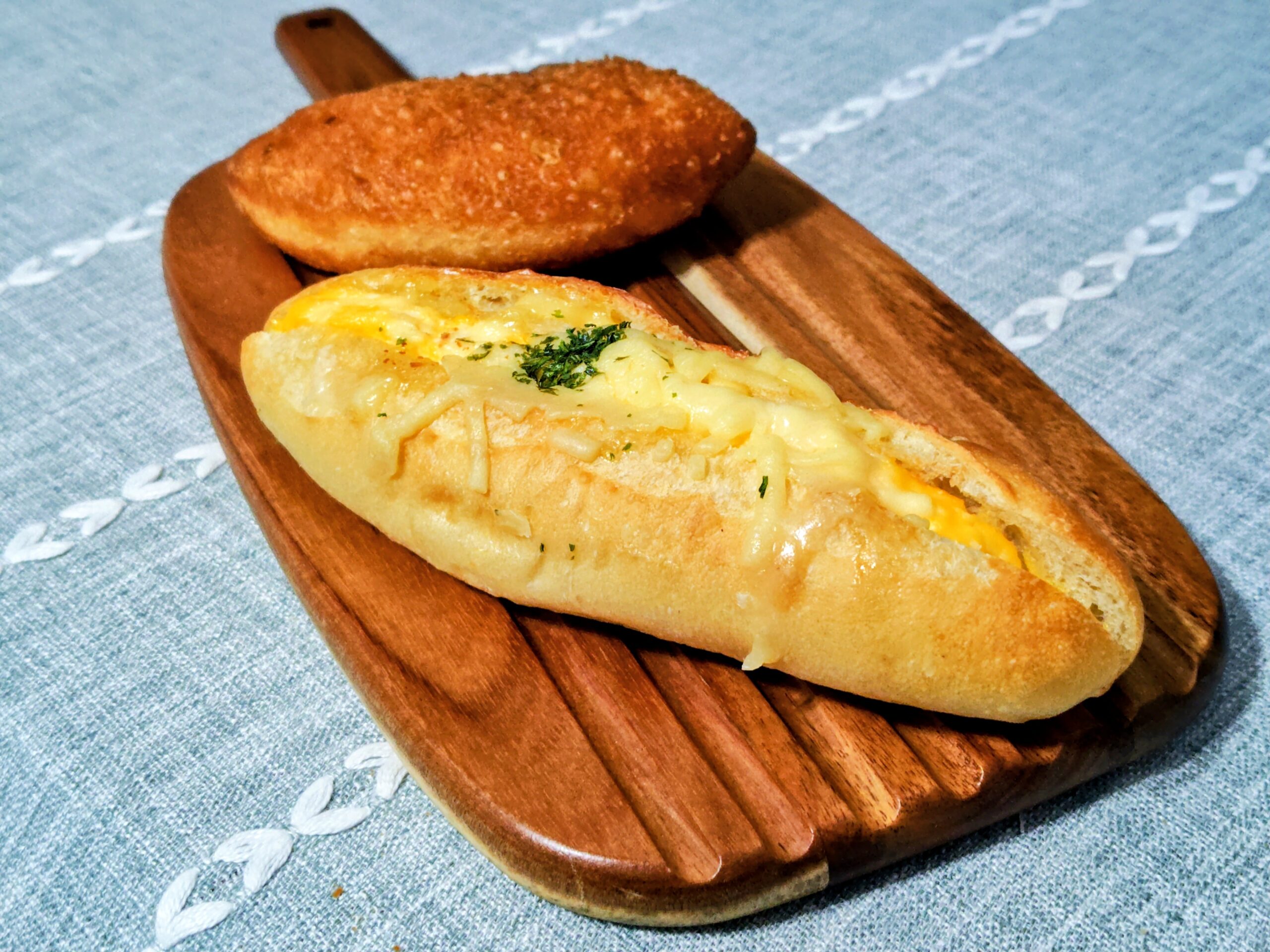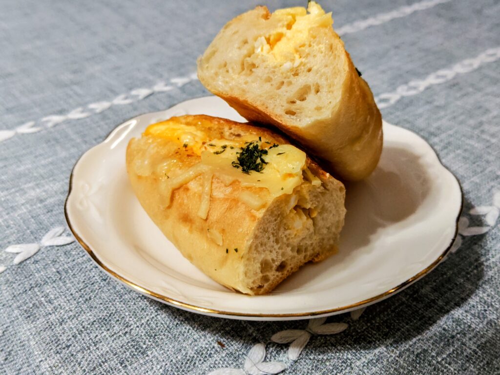 フランスパンに玉子サラダを挟み、チーズと青海苔をトッピングして焼き上げた惣菜パン!